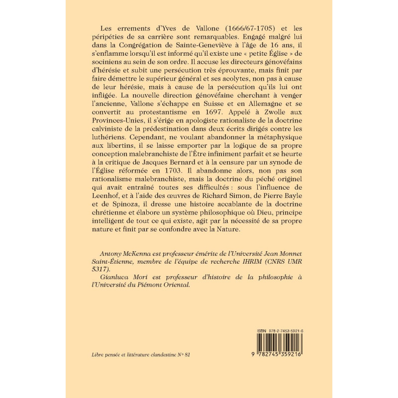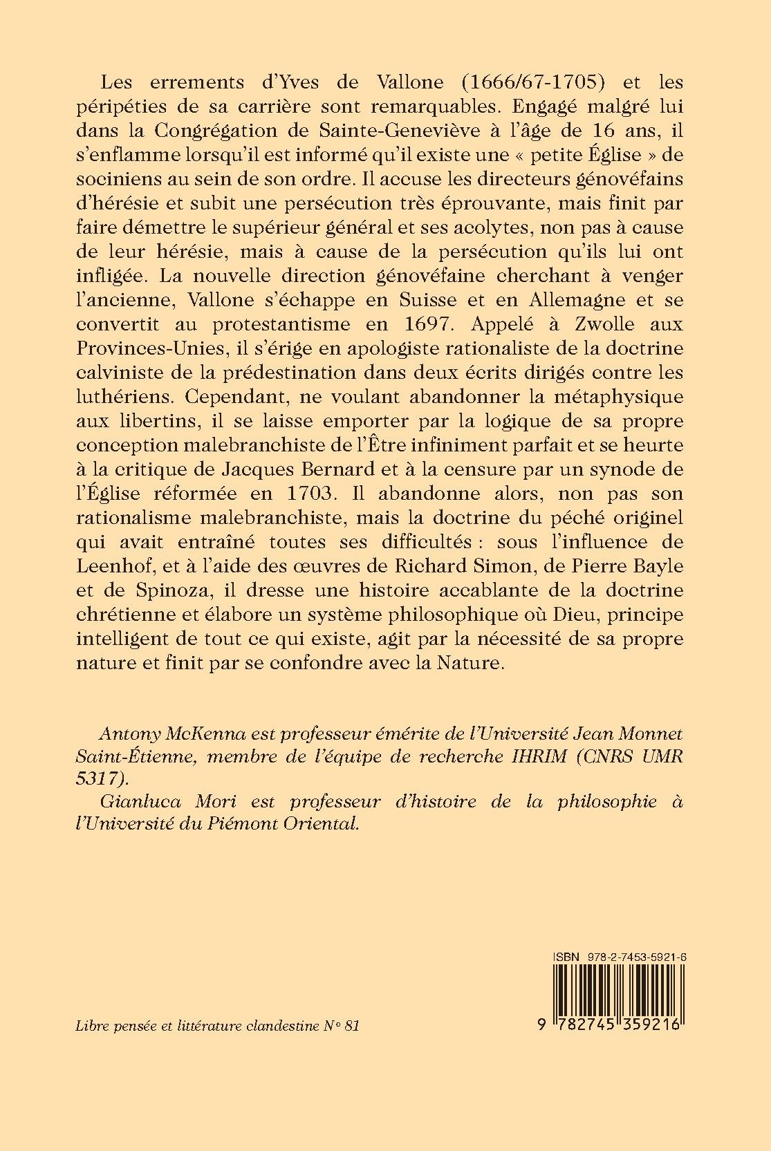 Les errements d’Yves de Vallone (1666/67-1705) et les péripéties de sa carrière sont remarquables. Engagé malgré lui dans la Congrégation de Sainte-Geneviève à l’âge de 16 ans, il s’enflamme lorsqu’il est informé qu’il existe une « petite Église » de sociniens au sein de son ordre. Il accuse les directeurs génovéfains d’hérésie et subit une persécution très éprouvante, mais finit par faire démettre le supérieur général et ses acolytes, non pas à cause de leur hérésie, mais à cause de la persécution qu’ils lui ont infligée. La nouvelle direction génovéfaine cherchant à venger l’ancienne, Vallone s’échappe en Suisse et en Allemagne et se convertit au protestantisme en 1697. Appelé à Zwolle aux Provinces-Unies, il s’érige en apologiste rationaliste de la doctrine calviniste de la prédestination dans deux écrits dirigés contre les luthériens. Cependant, ne voulant abandonner la métaphysique aux libertins, il se laisse emporter par la logique de sa propre conception malebranchiste de l’Être infiniment parfait et se heurte à la critique de Jacques Bernard et à la censure par un synode de l’Église réformée en 1703. Il abandonne alors, non pas son rationalisme malebranchiste, mais la doctrine du péché originel qui avait entraîné toutes ses difficultés : sous l’influence de Leenhof, et à l’aide des œuvres de Richard Simon, de Pierre Bayle et de Spinoza, il dresse une histoire accablante de la doctrine chrétienne et élabore un système philosophique où Dieu, principe intelligent de tout ce qui existe, agit par la nécessité de sa propre nature et finit par se confondre avec la Nature.