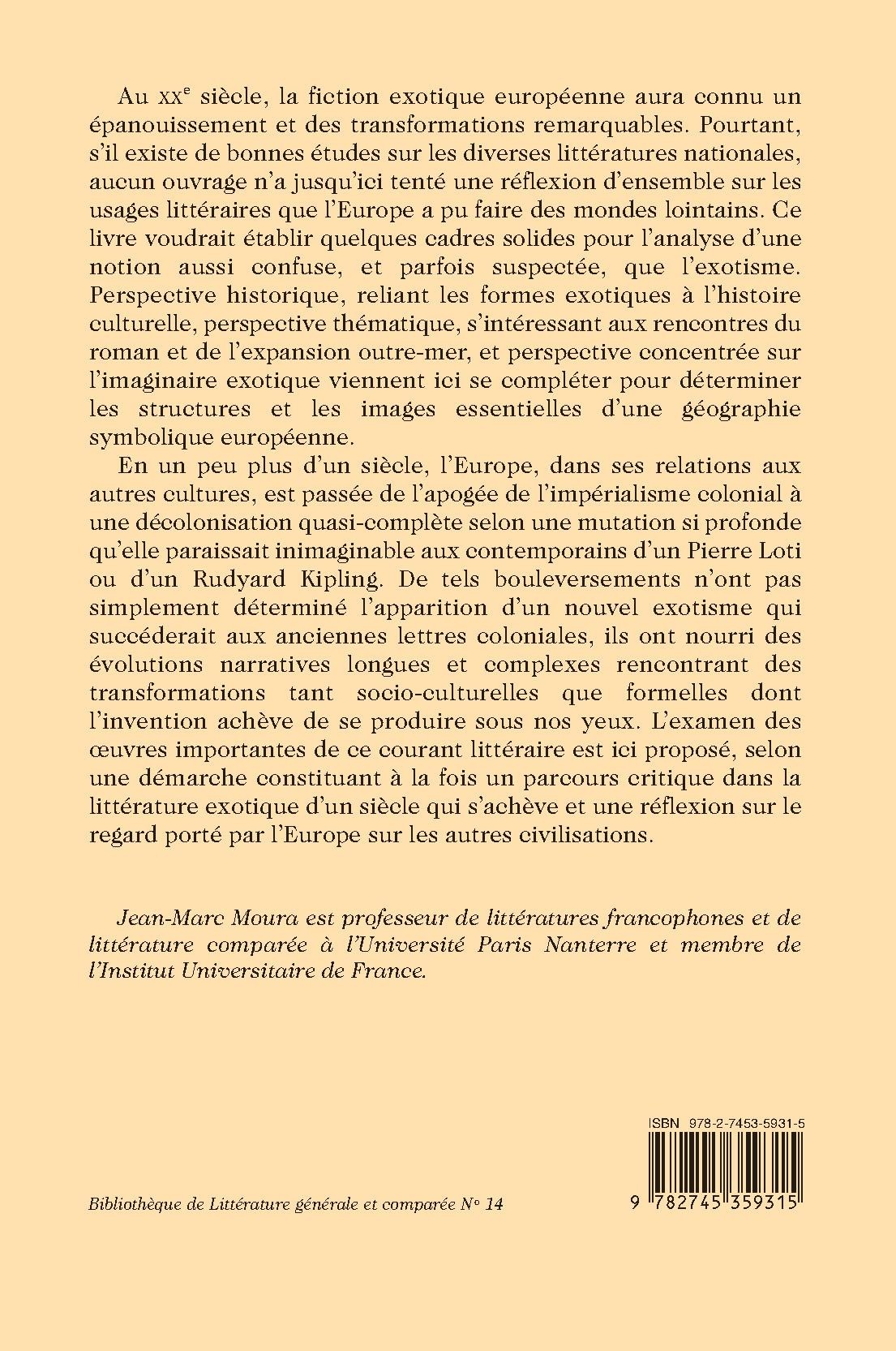 En un peu plus d’un siècle, l’Europe, dans ses relations aux autres cultures, est passée de l’apogée de l’impérialisme colonial à une décolonisation quasi-complète selon une mutation si profonde qu’elle paraissait inimaginable aux contemporains d’un Pierre Loti ou d’un Rudyard Kipling. De tels bouleversements n’ont pas simplement déterminé l’apparition d’un nouvel exotisme qui succéderait aux anciennes lettres coloniales, ils ont nourri des évolutions narratives longues et complexes rencontrant des transformations tant socio-culturelles que formelles dont l’invention achève de se produire sous nos yeux. L’examen des œuvres importantes de ce courant littéraire est ici proposé, selon une démarche constituant à la fois un parcours critique dans la littérature exotique d’un siècle qui s’achève et une réflexion sur le regard porté par l’Europe sur les autres civilisations.