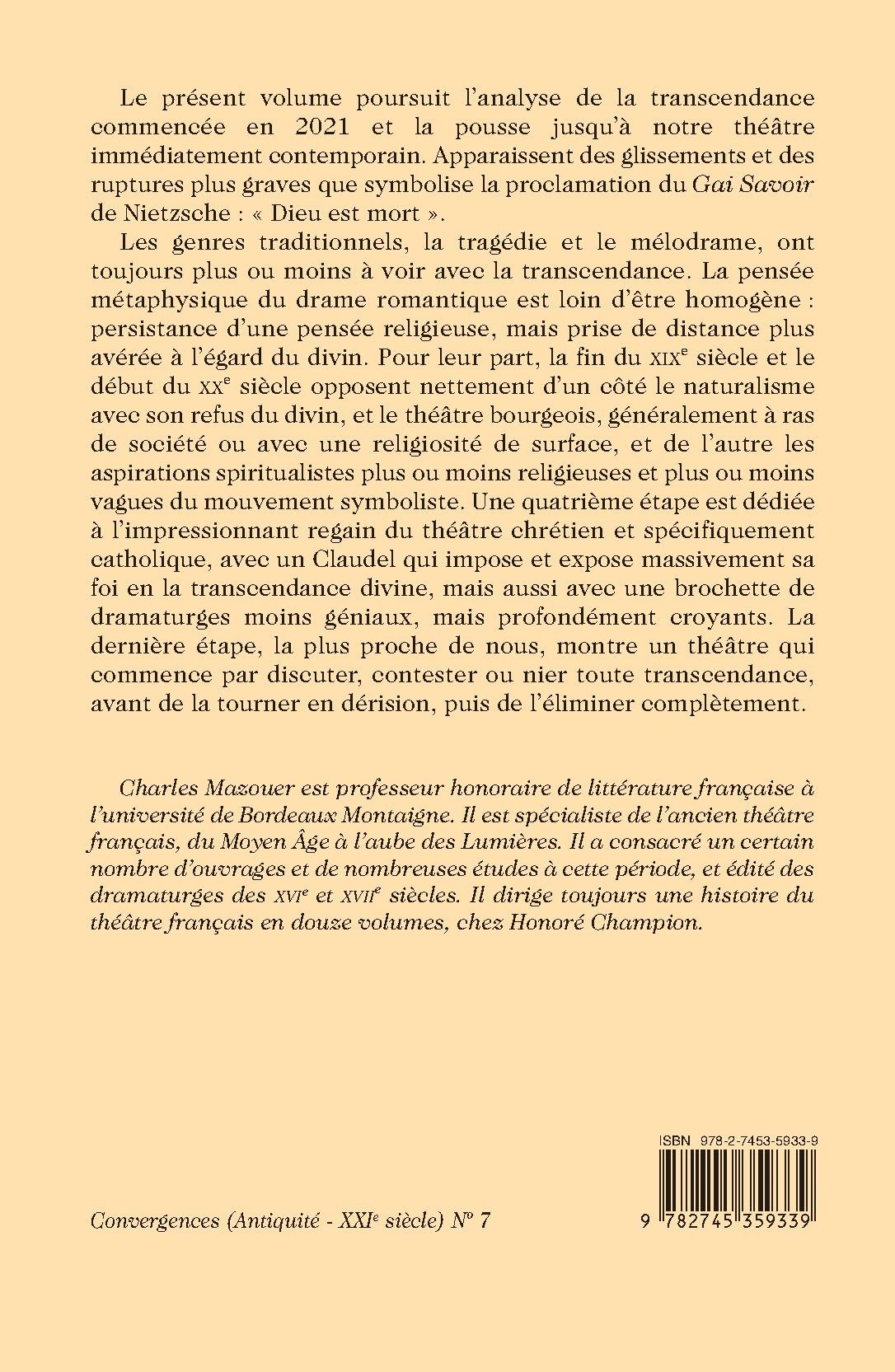 Les genres traditionnels, la tragédie et le mélodrame, ont toujours plus ou moins à voir avec la transcendance. La pensée métaphysique du drame romantique est loin d’être homogène : persistance d’une pensée religieuse, mais prise de distance plus avérée à l’égard du divin. Pour leur part, la fin du XIXe siècle et le début du XXe siècle opposent nettement d’un côté le naturalisme avec son refus du divin, et le théâtre bourgeois, généralement à ras de société ou avec une religiosité de surface, et de l’autre les aspirations spiritualistes plus ou moins religieuses et plus ou moins vagues du mouvement symboliste. Une quatrième étape est dédiée à l’impressionnant regain du théâtre chrétien et spécifiquement catholique, avec un Claudel qui impose et expose massivement sa foi en la transcendance divine, mais aussi avec une brochette de dramaturges moins géniaux, mais profondément croyants. La dernière étape, la plus proche de nous, montre un théâtre qui commence par discuter, contester ou nier toute transcendance, avant de la tourner en dérision, puis de l’éliminer complètement.
