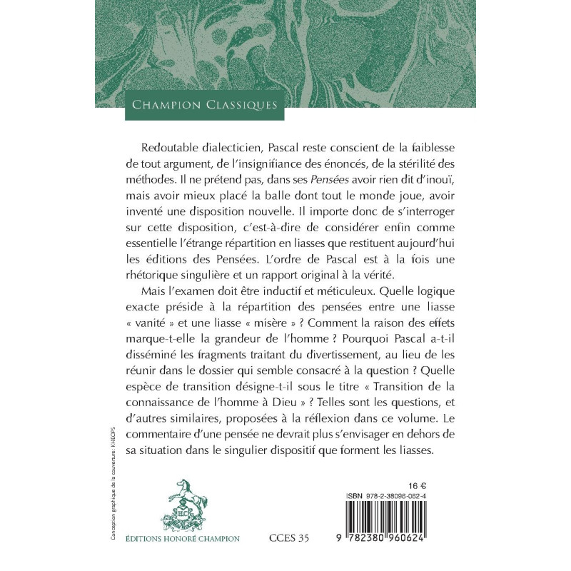 Redoutable dialecticien, Pascal reste conscient de la faiblesse de tout argument, de l’insignifiance des énoncés, de la stérilité des méthodes. Il ne prétend pas, dans ses Pensées avoir rien dit d’inouï, mais avoir mieux placé la balle dont tout le monde joue, avoir inventé une disposition nouvelle. Il importe donc de s’interroger sur cette disposition, c’est-à-dire de considérer enfin comme essentielle l’étrange répartition en liasses que restituent aujourd’hui les éditions des Pensées. L’ordre de Pascal est à la fois une rhétorique singulière et un rapport original à la vérité. Mais l’examen doit être inductif et méticuleux. Quelle logique exacte préside à la répartition des pensées entre une liasse « vanité » et une liasse « misère » ? Comment la raison des effets marque-t-elle la grandeur de l’homme ? Pourquoi Pascal a-t-il disséminé les fragments traitant du divertissement, au lieu de les réunir dans le dossier qui semble consacré à la question ? Quelle espèce de transition désigne-t-il sous le titre « Transition de la connaissance de l’homme à Dieu » ? Telles sont les questions, et d’autres similaires, proposées à la réflexion dans ce volume. Le commentaire d’une pensée ne devrait plus s’envisager en dehors de sa situation dans le singulier dispositif que forment les liasses.