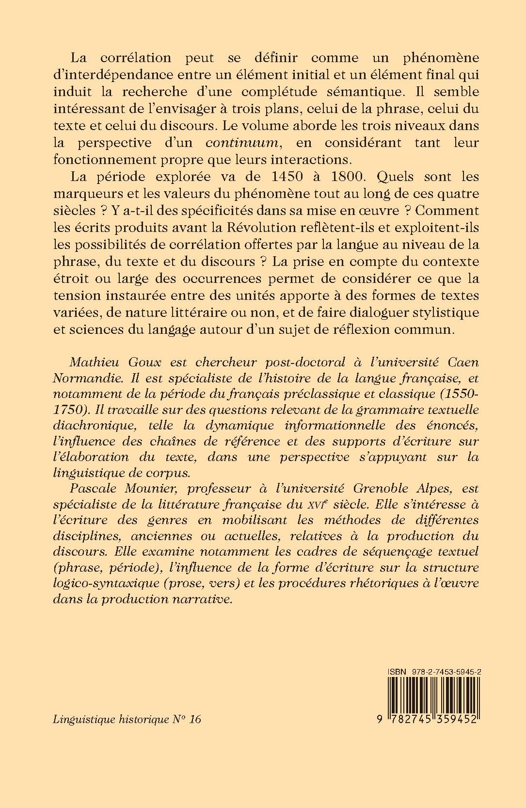 La corrélation peut se définir comme un phénomène d’interdépendance entre un élément initial et un élément final qui induit la recherche d’une complétude sémantique. Il semble intéressant de l’envisager à trois plans, celui de la phrase, celui du texte et celui du discours. Le volume aborde les trois niveaux dans la perspective d’un continuum, en considérant tant leur fonctionnement propre que leurs interactions.