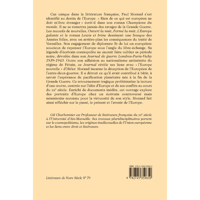 Cas unique dans la littérature française, Paul Morand s’est identifié au destin de l’Europe. « Rien de ce qui est européen ne doit m’être étranger » écrit-il dans son roman Champions du monde. Il ne se remettra jamais des ravages de la Grande Guerre. Les recueils de nouvelles, Ouvert la nuit, Fermé la nuit, L’Europe galante et le roman Lewis et Irène dessinent une fresque des Années folles, avec en arrière-plan les conséquences du traité de Versailles. Son engagement de diplomate fit de lui un européiste soucieux de repenser l’Europe sous l’angle du libre-échange. Sa légende d’écrivain cosmopolite ne saurait faire oublier sa période noire, dévoilée dans son Journal de guerre Londres-Paris-Vichy 1939-1943. Outre son adhésion au nationalisme antisémite du régime de Pétain, ce Journal révèle ses liens avec « l’Europe nouvelle » d’Hitler. Morand incarne la déception de l’Européen de l’entre-deux-guerres. Il a détruit ce qu’il avait contribué à bâtir, à savoir l’espérance de pacification planétaire née à la fin de la Grande Guerre. Ce retournement tragique problématise la lecture d’une œuvre, centrée sur l’idée d’Europe et de ses conflits au cours du XXe siècle. Enrichi de documents inédits, cet ouvrage explore des portraits d’Europe chez un écrivain controversé mais néanmoins reconnu pour la virtuosité de son style. Morand fait ainsi réfléchir sur le passé, le présent et l’avenir de l’Europe.