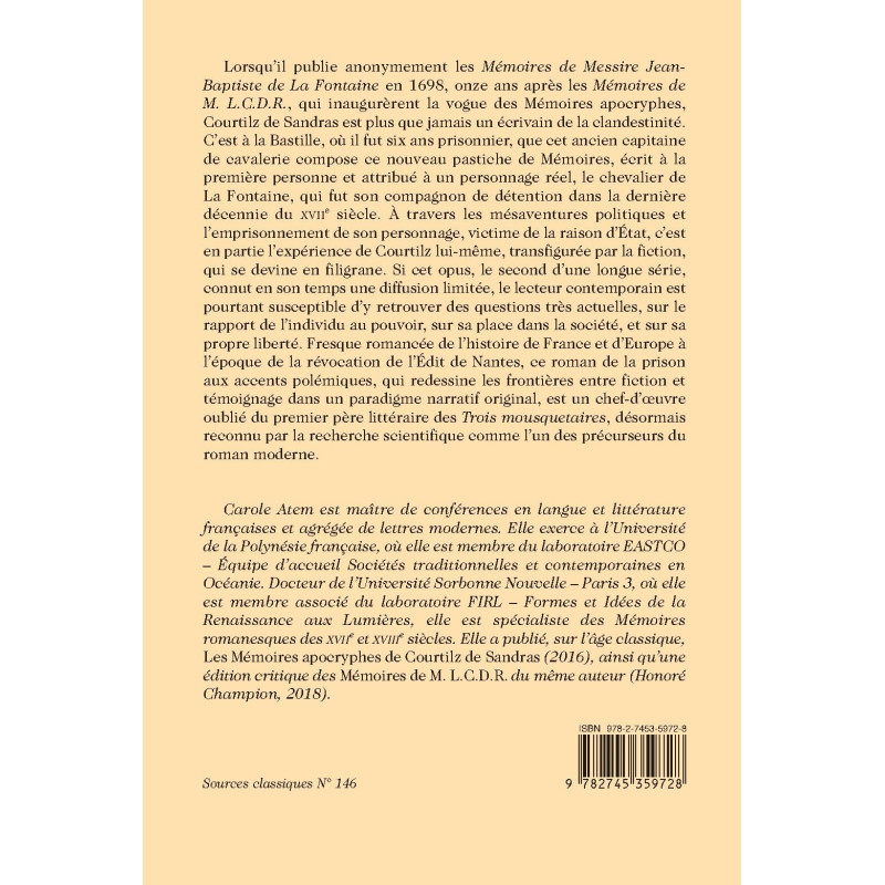 Lorsqu’il publie anonymement les Mémoires de Messire Jean- Baptiste de La Fontaine en 1698, onze ans après les Mémoires de M. L.C.D.R., qui inaugurèrent la vogue des Mémoires apocryphes, Courtilz de Sandras est plus que jamais un écrivain de la clandestinité. C’est à la Bastille, où il fut six ans prisonnier, que cet ancien capitaine de cavalerie compose ce nouveau pastiche de Mémoires, écrit à la première personne et attribué à un personnage réel, le chevalier de La Fontaine, qui fut son compagnon de détention dans la dernière décennie du XVIIe siècle. À travers les mésaventures politiques et l’emprisonnement de son personnage, victime de la raison d’État, c’est en partie l’expérience de Courtilz lui-même, transfigurée par la fiction, qui se devine en filigrane. Si cet opus, le second d’une longue série, connut en son temps une diffusion limitée, le lecteur contemporain est pourtant susceptible d’y retrouver des questions très actuelles, sur le rapport de l’individu au pouvoir, sur sa place dans la société, et sur sa propre liberté. Fresque romancée de l’histoire de France et d’Europe à l’époque de la révocation de l’Édit de Nantes, ce roman de la prison aux accents polémiques, qui redessine les frontières entre fiction et témoignage dans un paradigme narratif original, est un chef-d’œuvre oublié du premier père littéraire des Trois mousquetaires, désormais reconnu par la recherche scientifique comme l’un des précurseurs du roman moderne.