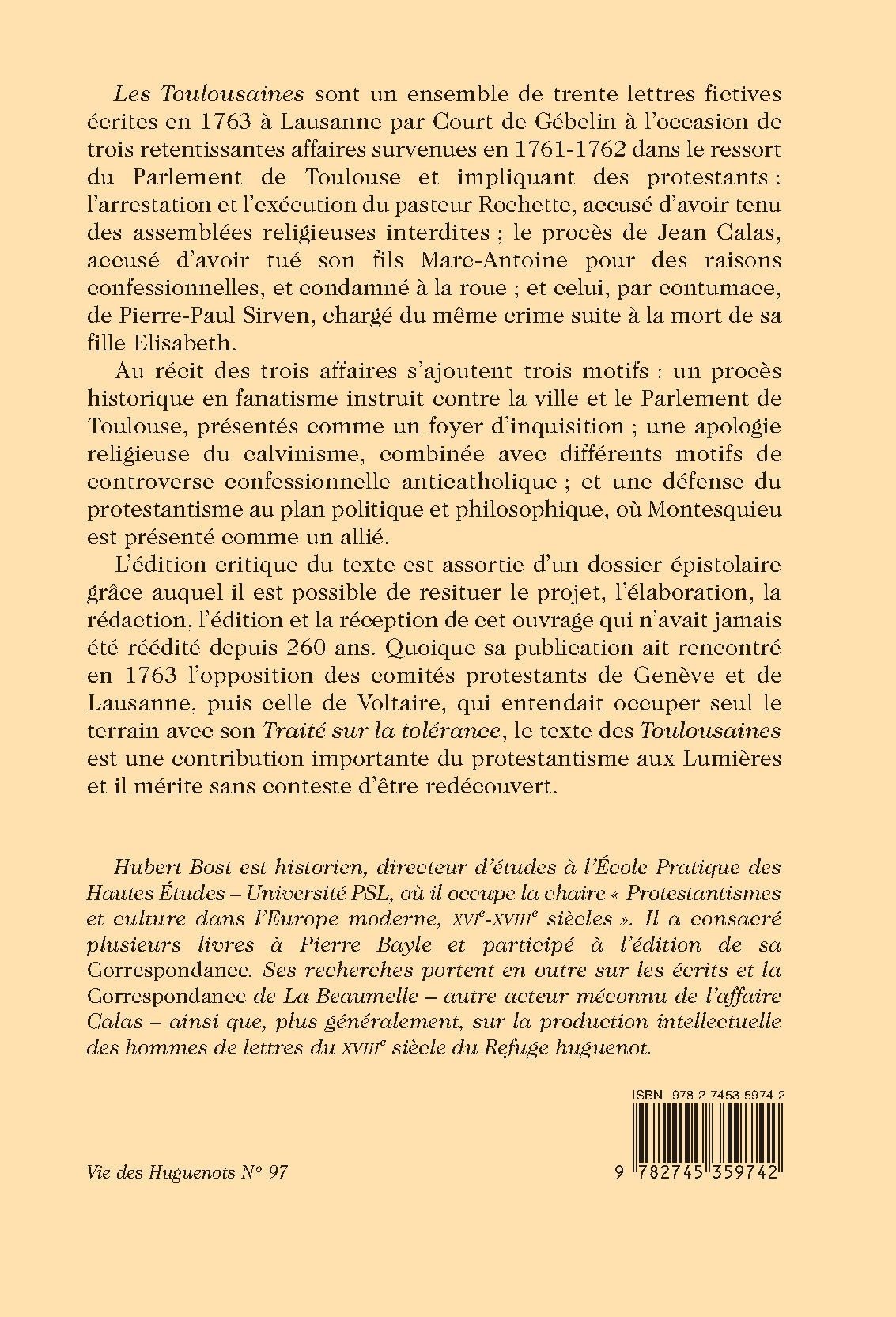 L’édition critique du texte est assortie d’un dossier épistolaire grâce auquel il est possible de resituer le projet, l’élaboration, la rédaction, l’édition et la réception de cet ouvrage qui n’avait jamais été réédité depuis 260 ans. Quoique sa publication ait rencontré en 1763 l’opposition des comités protestants de Genève et de Lausanne, puis celle de Voltaire, qui entendait occuper seul le terrain avec son Traité sur la tolérance, le texte des Toulousaines est une contribution importante du protestantisme aux Lumières et il mérite sans conteste d’être redécouvert.