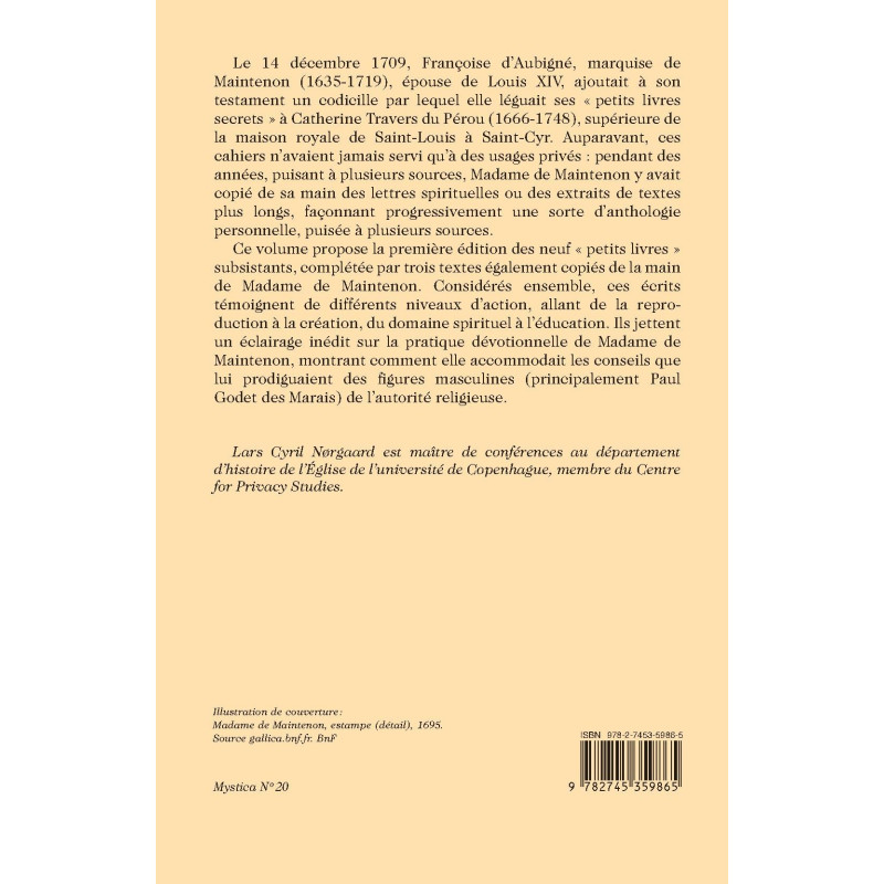 Le 14 décembre 1709, Françoise d’Aubigné, marquise de Maintenon (1635-1719), épouse de Louis XIV, ajoutait à son testament un codicille par lequel elle léguait ses « petits livres secrets » à Catherine Travers du Pérou (1666-1748), supérieure de la maison royale de Saint-Louis à Saint-Cyr. Auparavant, ces cahiers n’avaient jamais servi qu’à des usages privés : pendant des années, puisant à plusieurs sources, Madame de Maintenon y avait copié de sa main des lettres spirituelles ou des extraits de textes plus longs, façonnant progressivement une sorte d’anthologie personnelle, puisée à plusieurs sources.