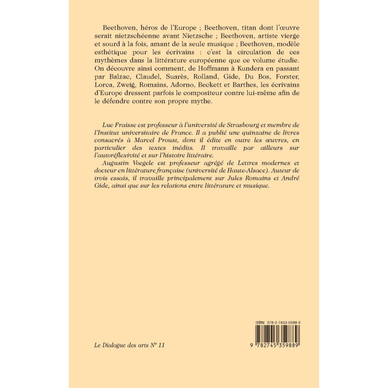 Beethoven, héros de l’Europe ; Beethoven, titan dont l’œuvre serait nietzschéenne avant Nietzsche ; Beethoven, artiste vierge et sourd à la fois, amant de la seule musique ; Beethoven, modèle esthétique pour les écrivains : c’est la circulation de ces mythèmes dans la littérature européenne que ce volume étudie. On découvre ainsi comment, de Hoffmann à Kundera en passant par Balzac, Claudel, Suarès, Rolland, Gide, Du Bos, Forster, Lorca, Zweig, Romains, Adorno, Beckett et Barthes, les écrivains d’Europe dressent parfois le compositeur contre lui-même afin de le défendre contre son propre mythe.