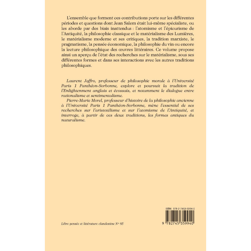 L’ensemble que forment ces contributions porte sur les différentes périodes et questions dont Jean Salem était lui-même spécialiste, ou les aborde par des biais inattendus : l’atomisme et l’épicurisme de l’Antiquité, la philosophie classique et le matérialisme des Lumières, le matérialisme moderne et ses critiques, la tradition marxiste, le pragmatisme, la pensée économique, la philosophie du vin ou encore la lecture philosophique des œuvres littéraires. Ce volume propose ainsi un aperçu de l’état des recherches sur le matérialisme, sous ses différentes formes et dans ses interactions avec les autres traditions philosophiques.