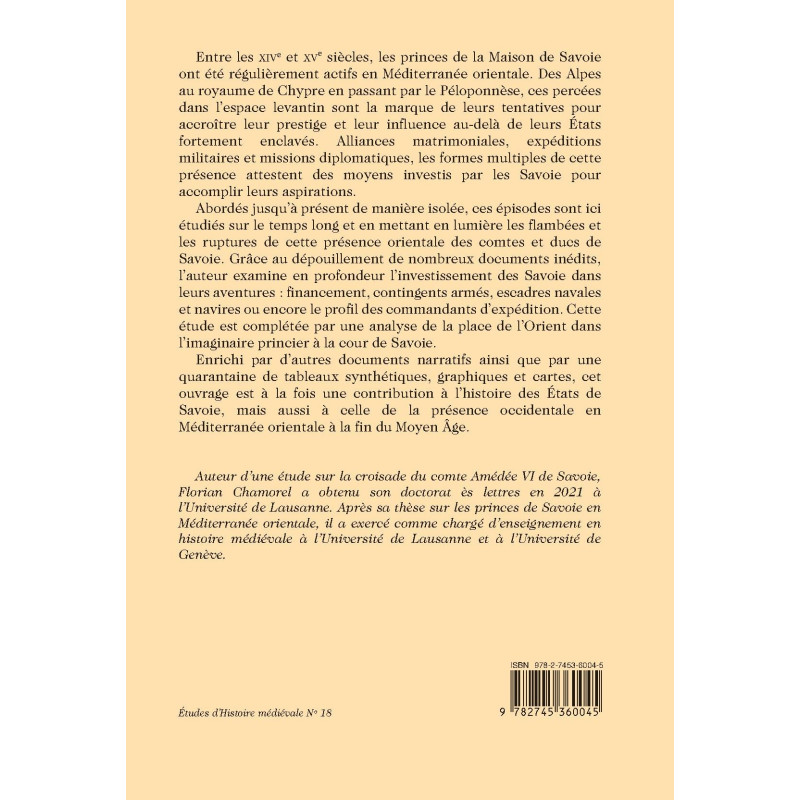 Entre les XIVe et XVe siècles, les princes de la Maison de Savoie ont été régulièrement actifs en Méditerranée orientale. Des Alpes au royaume de Chypre en passant par le Péloponnèse, ces percées dans l’espace levantin sont la marque de leurs tentatives pour accroître leur prestige et leur influence au-delà de leurs États fortement enclavés. Alliances matrimoniales, expéditions militaires et missions diplomatiques, les formes multiples de cette présence attestent des moyens investis par les Savoie pour accomplir leurs aspirations.