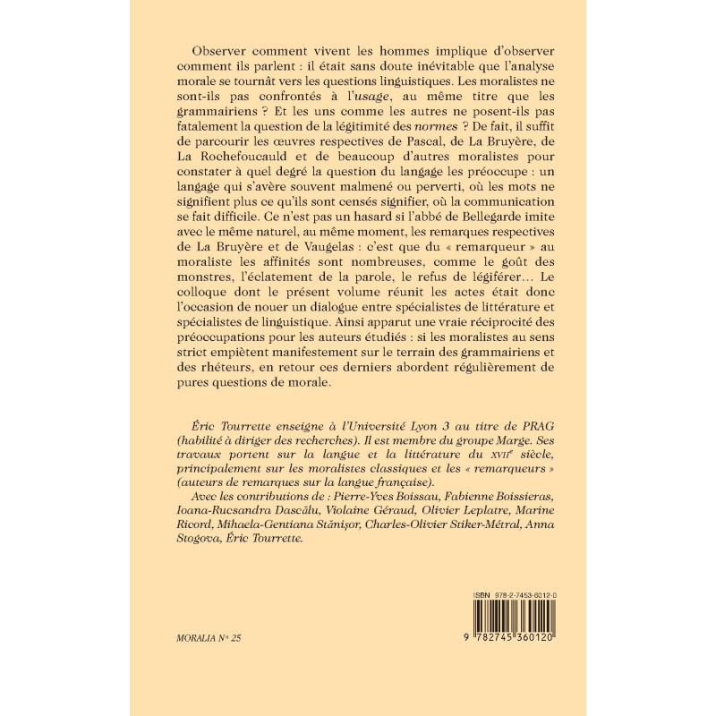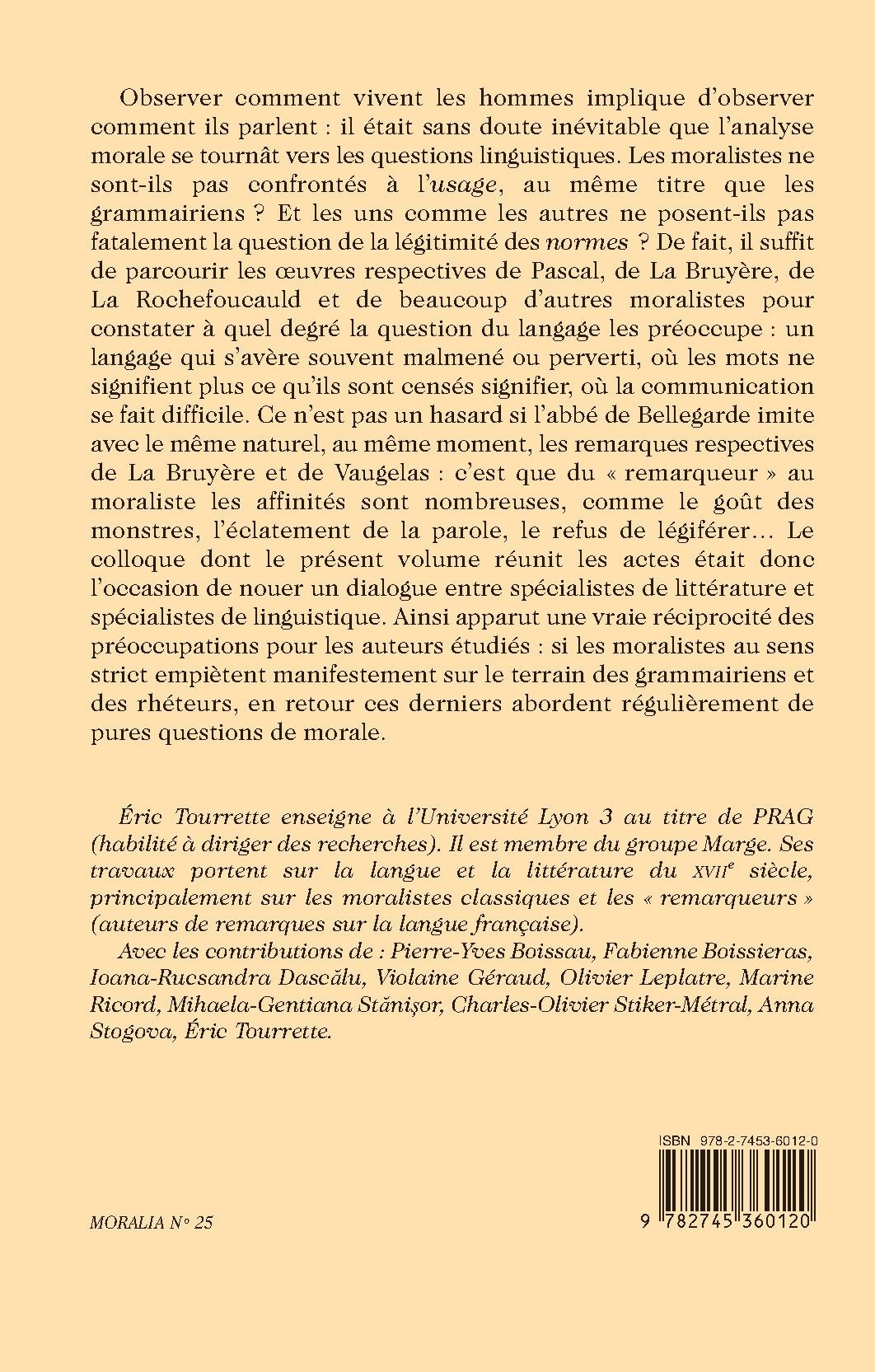 Observer comment vivent les hommes implique d’observer comment ils parlent : il était sans doute inévitable que l’analyse morale se tournât vers les questions linguistiques. Les moralistes ne sont-ils pas confrontés à l’usage, au même titre que les grammairiens ? Et les uns comme les autres ne posent-ils pas fatalement la question de la légitimité des normes ? De fait, il suffit de parcourir les œuvres respectives de Pascal, de La Bruyère, de La Rochefoucauld et de beaucoup d’autres moralistes pour constater à quel degré la question du langage les préoccupe : un langage qui s’avère souvent malmené ou perverti, où les mots ne signifient plus ce qu’ils sont censés signifier, où la communication se fait difficile. Ce n’est pas un hasard si l’abbé de Bellegarde imite avec le même naturel, au même moment, les remarques respectives de La Bruyère et de Vaugelas : c’est que du « remarqueur » au moraliste les affinités sont nombreuses, comme le goût des monstres, l’éclatement de la parole, le refus de légiférer… Le colloque dont le présent volume réunit les actes était donc l’occasion de nouer un dialogue entre spécialistes de littérature et spécialistes de linguistique. Ainsi apparut une vraie réciprocité des préoccupations pour les auteurs étudiés : si les moralistes au sens strict empiètent manifestement sur le terrain des grammairiens et des rhéteurs, en retour ces derniers abordent régulièrement de pures questions de morale.