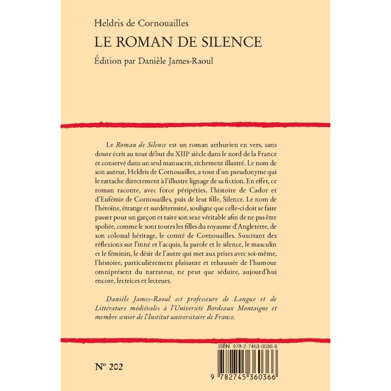 Le Roman de Silence est un roman arthurien en vers, sans doute écrit au tout début du XIIIe siècle dans le nord de la France et conservé dans un seul manuscrit, richement illustré. Le nom de son auteur, Heldris de Cornouailles, a tout d’un pseudonyme qui le rattache directement à l’illustre lignage de sa fiction. En effet, ce roman raconte, avec force péripéties, l’histoire de Cador et d’Eufémie de Cornouailles, puis de leur fille, Silence. Le nom de l’héroïne, étrange et surdéterminé, souligne que celle-ci doit se faire passer pour un garçon et taire son sexe véritable afin de ne pas être spoliée, comme le sont toutes les filles du royaume d’Angleterre, de son colossal héritage, le comté de Cornouailles. Suscitant des réflexions sur l’inné et l’acquis, la parole et le silence, le masculin et le féminin, le désir de l’autre qui met aux prises avec soi-même, l’histoire, particulièrement plaisante et rehaussée de l’humour omniprésent du narrateur, ne peut que séduire, aujourd’hui encore, lectrices et lecteurs.
