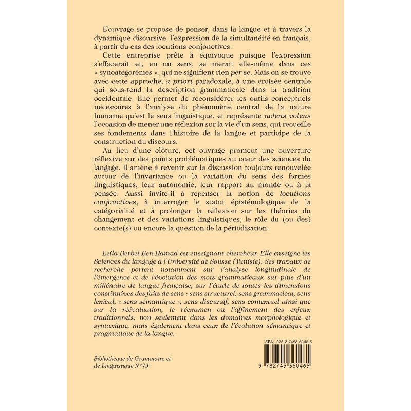 L’ouvrage se propose de penser, dans la langue et à travers la dynamique discursive, l’expression de la simultanéité en français, à partir du cas des locutions conjonctives.
