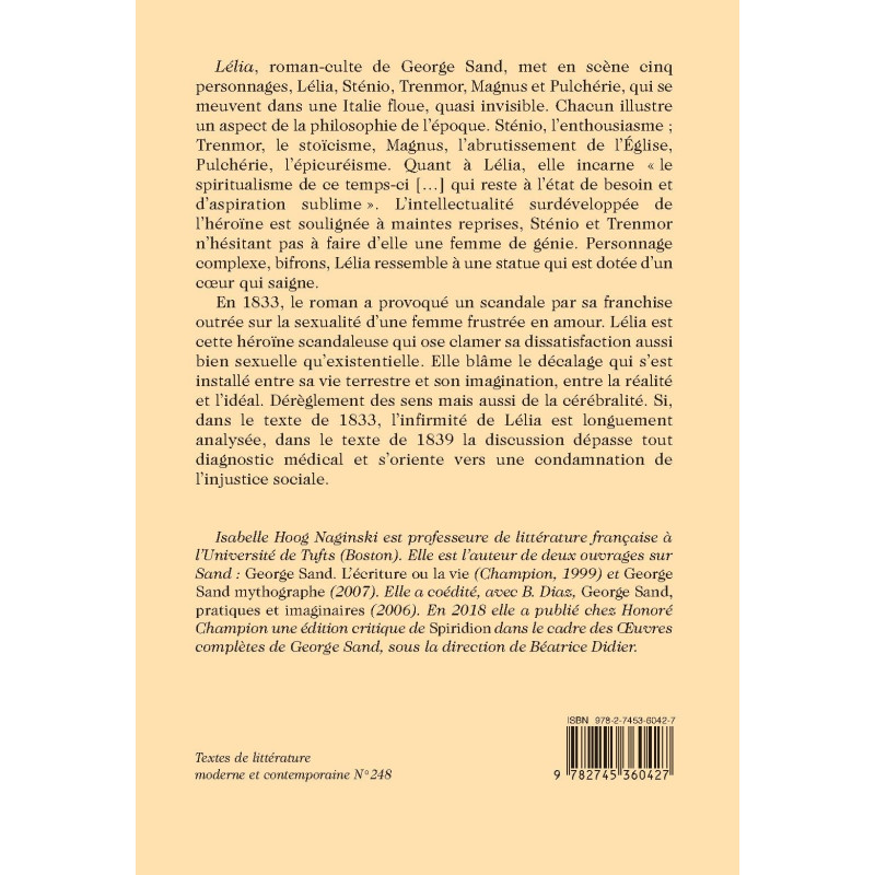 Isabelle Hoog Naginski est professeure de littérature française à l’Université de Tufts (Boston). Elle est l’auteur de deux ouvrages sur Sand : George Sand. L’écriture ou la vie (Champion, 1999) et George Sand mythographe (2007). Elle a coédité, avec B. Diaz, George Sand, pratiques et imaginaires (2006). En 2018 elle a publié chez Honoré Champion une édition critique de Spiridion dans le cadre des Œuvres complètes de George Sand, sous la direction de Béatrice Didier.