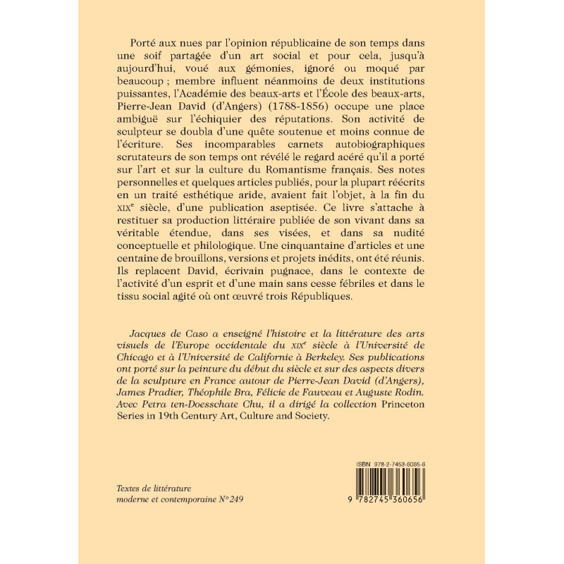 Porté aux nues par l’opinion républicaine de son temps dans une soif partagée d’un art social et pour cela, jusqu’à aujourd’hui, voué aux gémonies, ignoré ou moqué par beaucoup ; membre influent néanmoins de deux institutions puissantes, l’Académie des beaux-arts et l’École des beaux-arts, Pierre-Jean David (d’Angers) (1788-1856) occupe une place ambiguë sur l’échiquier des réputations. Son activité de sculpteur se doubla d’une quête soutenue et moins connue de l’écriture. Ses incomparables carnets autobiographiques scrutateurs de son temps ont révélé le regard acéré qu’il a porté sur l’art et sur la culture du Romantisme français. Ses notes personnelles et quelques articles publiés, pour la plupart réécrits en un traité esthétique aride, avaient fait l’objet, à la fin du XIXe siècle, d’une publication aseptisée. Ce livre s’attache à restituer sa production littéraire publiée de son vivant dans sa véritable étendue, dans ses visées, et dans sa nudité conceptuelle et philologique. Une cinquantaine d’articles et une centaine de brouillons, versions et projets inédits, ont été réunis. Ils replacent David, écrivain pugnace, dans le contexte de l’activité d’un esprit et d’une main sans cesse fébriles et dans le tissu social agité où ont œuvré trois Républiques.