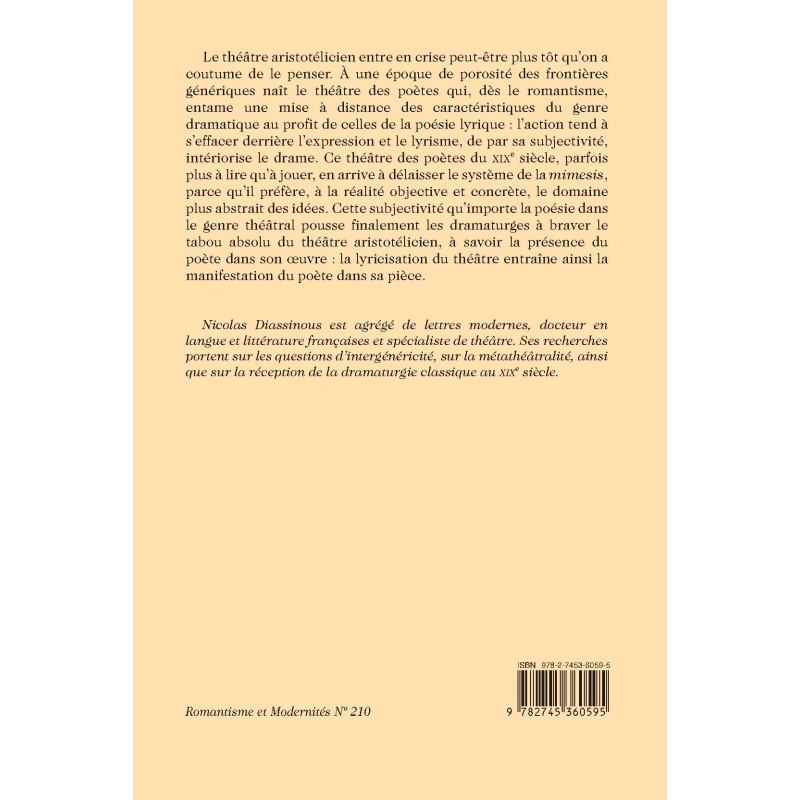 Le théâtre aristotélicien entre en crise peut-être plus tôt qu’on a coutume de le penser. À une époque de porosité des frontières génériques naît le théâtre des poètes qui, dès le romantisme, entame une mise à distance des caractéristiques du genre dramatique au profit de celles de la poésie lyrique : l’action tend à s’effacer derrière l’expression et le lyrisme, de par sa subjectivité, intériorise le drame. Ce théâtre des poètes du XIXe siècle, parfois plus à lire qu’à jouer, en arrive à délaisser le système de la mimesis, parce qu’il préfère, à la réalité objective et concrète, le domaine plus abstrait des idées. Cette subjectivité qu’importe la poésie dans le genre théâtral pousse finalement les dramaturges à braver le tabou absolu du théâtre aristotélicien, à savoir la présence du poète dans son œuvre : la lyricisation du théâtre entraîne ainsi la manifestation du poète dans sa pièce.