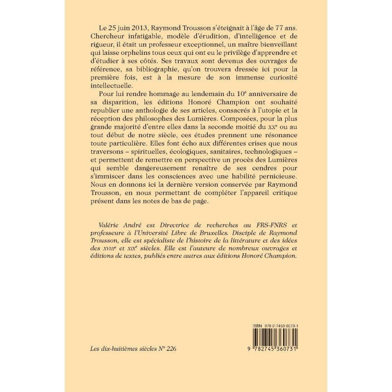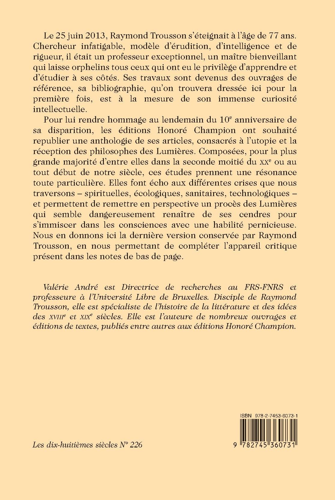 Pour lui rendre hommage au lendemain du 10e anniversaire de sa disparition, les éditions Honoré Champion ont souhaité republier une anthologie de ses articles, consacrés à l’utopie et la réception des philosophes des Lumières. Composées, pour la plus grande majorité d’entre elles dans la seconde moitié du XXe ou au tout début de notre siècle, ces études prennent une résonance toute particulière. Elles font écho aux différentes crises que nous traversons – spirituelles, écologiques, sanitaires, technologiques – et permettent de remettre en perspective un procès des Lumières qui semble dangereusement renaître de ses cendres pour s’immiscer dans les consciences avec une habilité pernicieuse. Nous en donnons ici la dernière version conservée par Raymond Trousson, en nous permettant de compléter l’appareil critique présent dans les notes de bas de page.