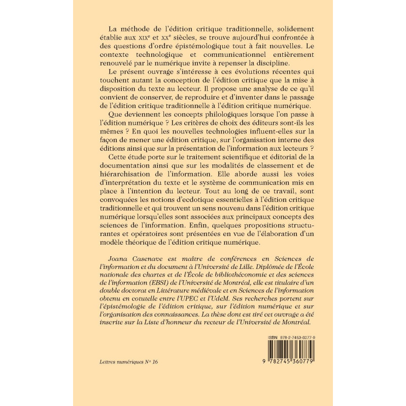 Joana Casenave est maître de conférences en Sciences de l’information et du document à l’Université de Lille. Diplômée de l’École nationale des chartes et de l’École de bibliothéconomie et des sciences de l’information (EBSI) de l’Université de Montréal, elle est titulaire d’un double doctorat en Littérature médiévale et en Sciences de l’information obtenu en cotutelle entre l’UPEC et l’UdeM. Ses recherches portent sur l’épistémologie de l’édition critique, sur l’édition numérique et sur l’organisation des connaissances. La thèse dont est tiré cet ouvrage a été inscrite sur la Liste d’honneur du recteur de l’Université de Montréal.