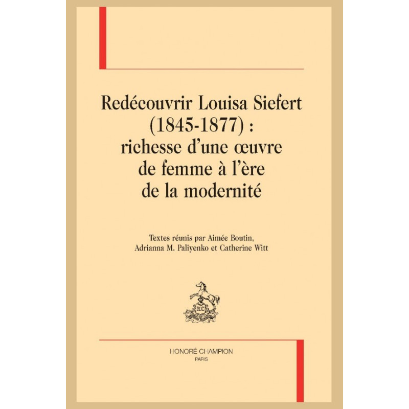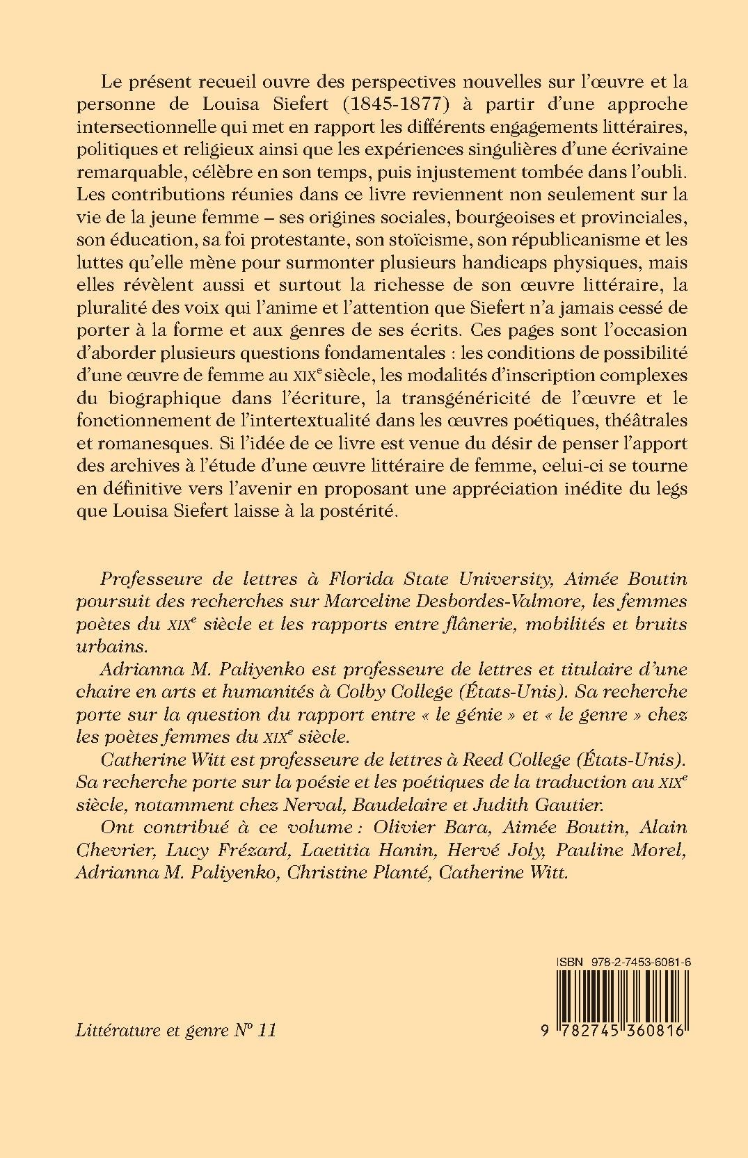 Le présent recueil ouvre des perspectives nouvelles sur l’œuvre et la personne de Louisa Siefert (1845-1877) à partir d’une approche intersectionnelle qui met en rapport les différents engagements littéraires, politiques et religieux ainsi que les expériences singulières d’une écrivaine remarquable, célèbre en son temps, puis injustement tombée dans l’oubli. Les contributions réunies dans ce livre reviennent non seulement sur la vie de la jeune femme – ses origines sociales, bourgeoises et provinciales, son éducation, sa foi protestante, son stoïcisme, son républicanisme et les luttes qu’elle mène pour surmonter plusieurs handicaps physiques, mais elles révèlent aussi et surtout la richesse de son œuvre littéraire, la pluralité des voix qui l’anime et l’attention que Siefert n’a jamais cessé de porter à la forme et aux genres de ses écrits. Ces pages sont l’occasion d’aborder plusieurs questions fondamentales : les conditions de possibilité d’une œuvre de femme au XIXe siècle, les modalités d’inscription complexes du biographique dans l’écriture, la transgénéricité de l’œuvre et le fonctionnement de l’intertextualité dans les œuvres poétiques, théâtrales et romanesques. Si l’idée de ce livre est venue du désir de penser l’apport des archives à l’étude d’une œuvre littéraire de femme, celui-ci se tourne en définitive vers l’avenir en proposant une appréciation inédite du legs que Louisa Siefert laisse à la postérité.
