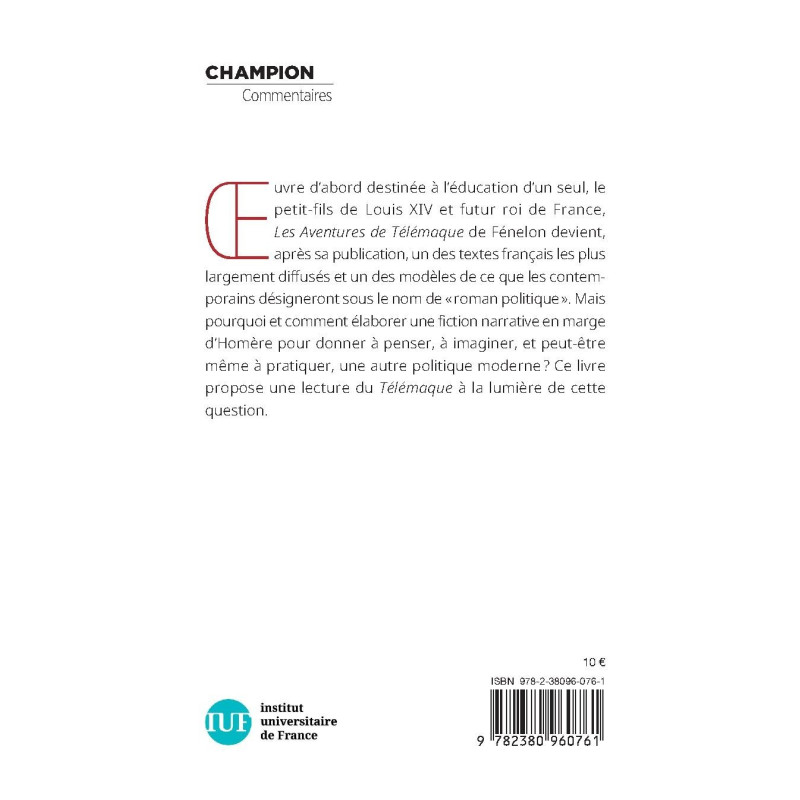 Œuvre d’abord destinée à l’éducation d’un seul, le petit-fils de Louis XIV et futur roi de France, Les Aventures de Télémaque de Fénelon devient, après sa publication, un des textes français les plus largement diffusés et un des modèles de ce que les contemporains désigneront sous le nom de « roman politique ». Mais pourquoi et comment élaborer une fiction narrative en marge d’Homère pour donner à penser, à imaginer, et peut-être même à pratiquer, une autre politique moderne ? Ce livre propose une lecture du Télémaque à la lumière de cette question.