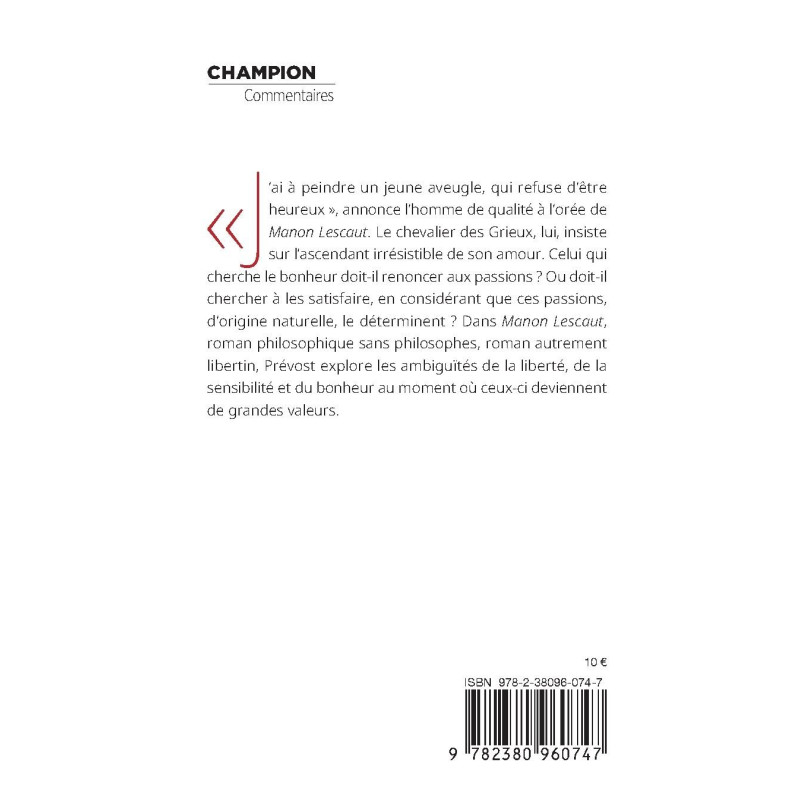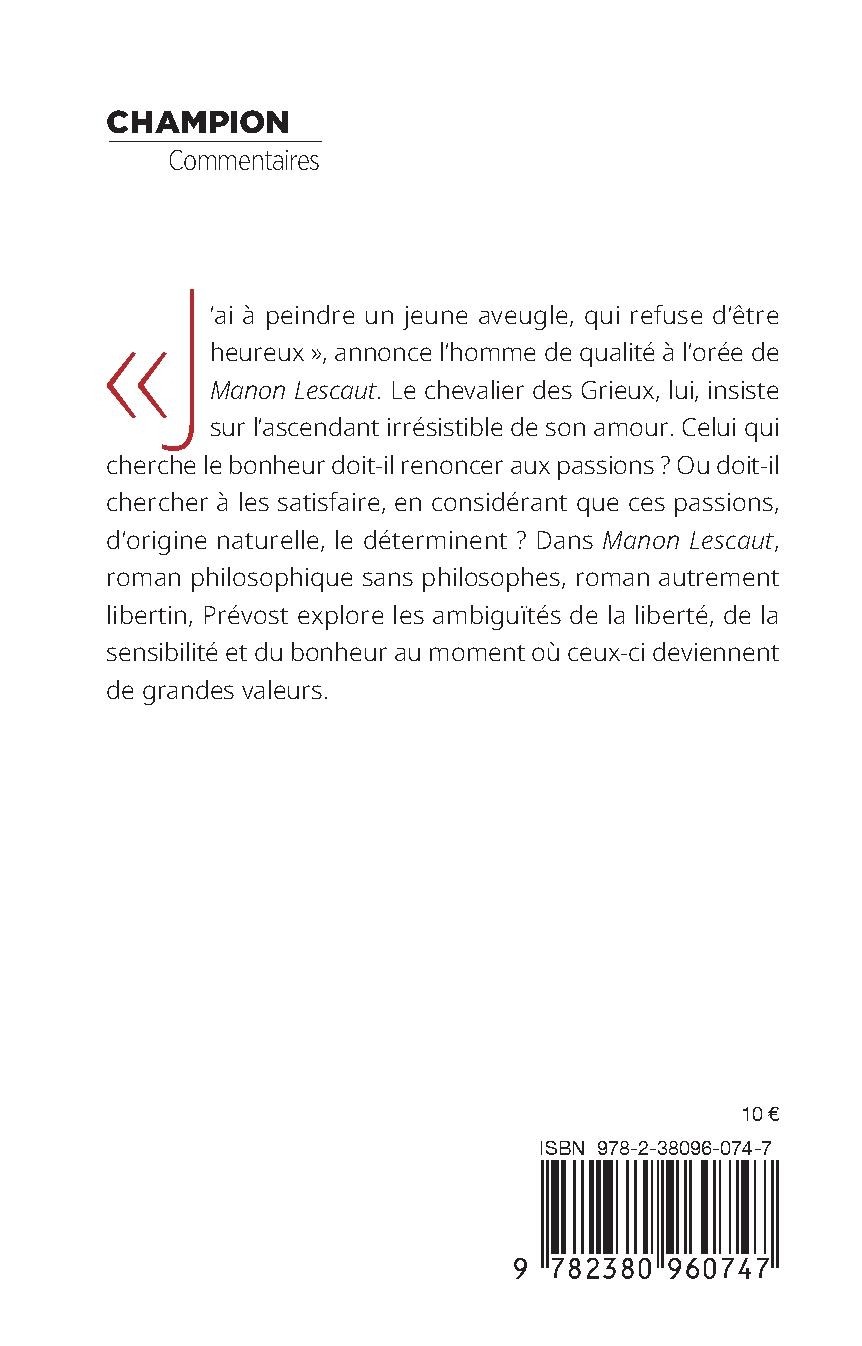 « J’ai à peindre un jeune aveugle, qui refuse d’être heureux », annonce l’homme de qualité à l’orée de Manon Lescaut. Le chevalier des Grieux, lui, insiste sur l’ascendant irrésistible de son amour. Celui qui cherche le bonheur doit-il renoncer aux passions ? Ou doit-il chercher à les satisfaire, en considérant que ces passions, d’origine naturelle, le déterminent ? Dans Manon Lescaut, roman philosophique sans philosophes, roman autrement libertin, Prévost explore les ambiguïtés de la liberté, de la sensibilité et du bonheur au moment où ceux-ci deviennent de grandes valeurs.