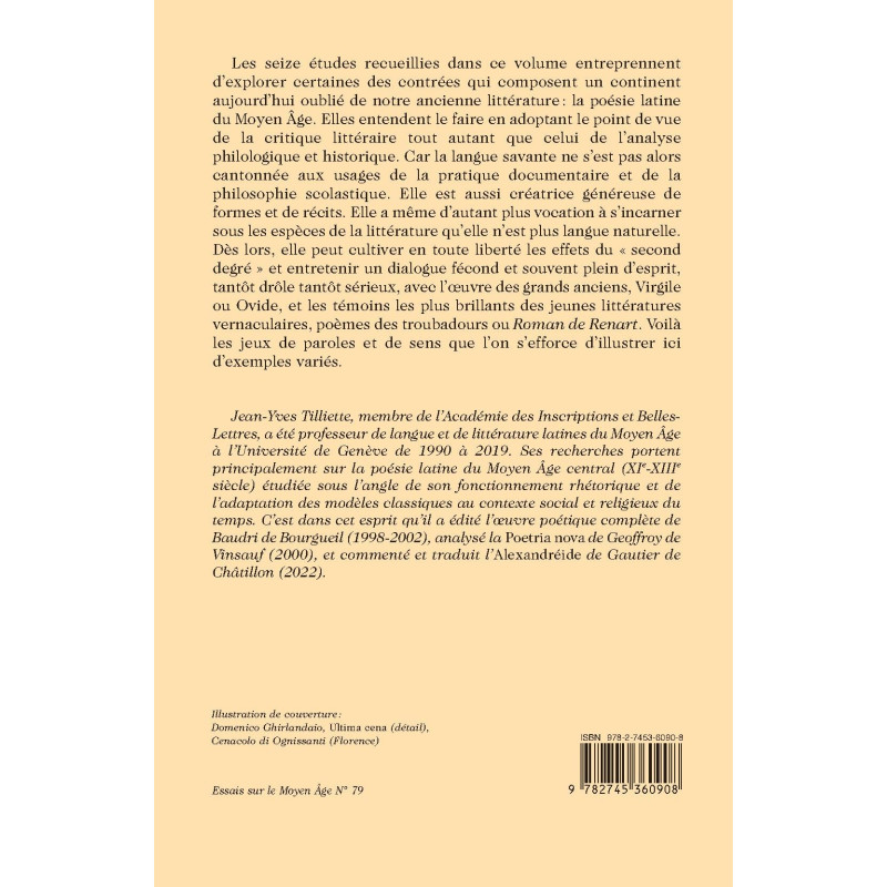 Jean-Yves Tilliette, membre de l’Académie des Inscriptions et Belles- Lettres, a été professeur de langue et de littérature latines du Moyen Âge à l’Université de Genève de 1990 à 2019. Ses recherches portent principalement sur la poésie latine du Moyen Âge central (XIe-XIIIe siècle) étudiée sous l’angle de son fonctionnement rhétorique et de l’adaptation des modèles classiques au contexte social et religieux du temps. C’est dans cet esprit qu’il a édité l’œuvre poétique complète de Baudri de Bourgueil (1998-2002), analysé la Pœtria nova de Geoffroy de Vinsauf (2000), et commenté et traduit l’Alexandréide de Gautier de Châtillon (2022).