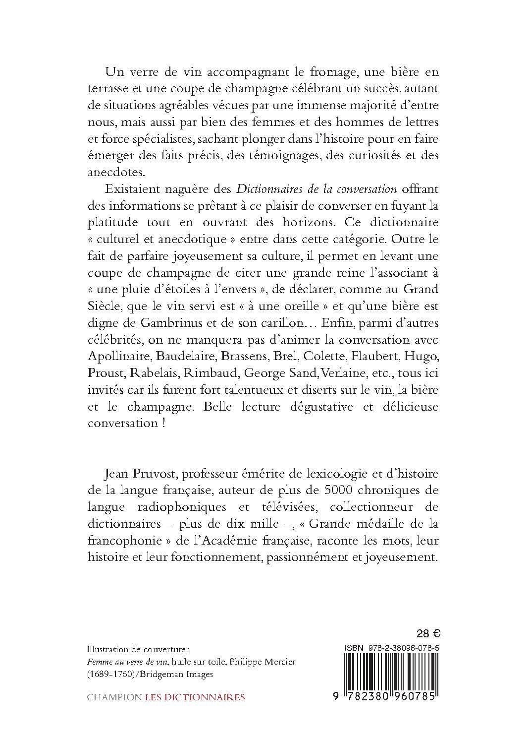 Existaient naguère des Dictionnaires de la conversation offrant des informations se prêtant à ce plaisir de converser en fuyant la platitude tout en ouvrant des horizons. Ce dictionnaire « culturel et anecdotique » entre dans cette catégorie. Outre le fait de parfaire joyeusement sa culture, il permet en levant une coupe de champagne de citer une grande reine l’associant à « une pluie d’étoiles à l’envers », de déclarer, comme au Grand Siècle, que le vin servi est « à une oreille » et qu’une bière est digne de Gambrinus et de son carillon… Enfin, parmi d’autres célébrités, on ne manquera pas d’animer la conversation avec Apollinaire, Baudelaire, Brassens, Brel, Colette, Flaubert, Hugo, Proust, Rabelais, Rimbaud, George Sand, Verlaine, etc., tous ici invités car ils furent fort talentueux et diserts sur le vin, la bière et le champagne. Belle lecture dégustative et délicieuse conversation !