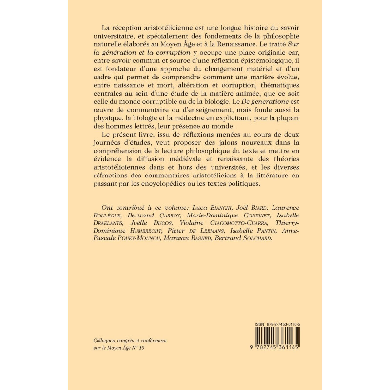 La réception aristotélicienne est une longue histoire du savoir universitaire, et spécialement des fondements de la philosophie naturelle élaborés au Moyen Âge et à la Renaissance. Le traité Sur la génération et la corruption y occupe une place originale car, entre savoir commun et source d’une réflexion épistémologique, il est fondateur d’une approche du changement matériel et d’un cadre qui permet de comprendre comment une matière évolue, entre naissance et mort, altération et corruption, thématiques centrales au sein d’une étude de la matière animée, que ce soit celle du monde corruptible ou de la biologie. Le De generatione est œuvre de commentaire ou d’enseignement, mais fonde aussi la physique, la biologie et la médecine en explicitant, pour la plupart des hommes lettrés, leur présence au monde.