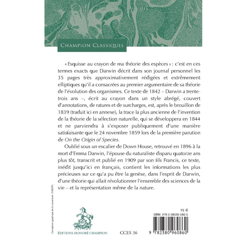 « Esquisse au crayon de ma théorie des espèces » : c’est en ces termes exacts que Darwin décrit dans son journal personnel les 35 pages très approximativement rédigées et extrêmement elliptiques qu’il a consacrées au premier argumentaire de sa théorie de l’évolution des organismes. Ce texte de 1842 – Darwin a trente-trois ans –, écrit au crayon dans un style abrégé, couvert d’annotations, de ratures et de surcharges, est, après le brouillon de 1839 (traduit ici en annexe), la trace la plus ancienne de l’invention de la théorie de la sélection naturelle, qui se développera en 1844 et ne parviendra à s’exposer publiquement d’une manière satisfaisante que le 24 novembre 1859 lors de la première parution de On the Origin of Species.