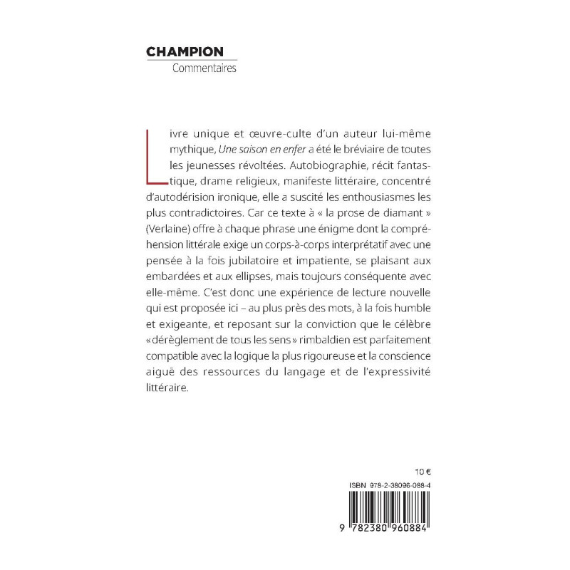 Livre unique et œuvre-culte d’un auteur lui-même mythique, Une saison en enfer a été le bréviaire de toutes les jeunesses révoltées. Autobiographie, récit fantastique, drame religieux, manifeste littéraire, concentré d’autodérision ironique, elle a suscité les enthousiasmes les plus contradictoires. Car ce texte à « la prose de diamant » (Verlaine) offre à chaque phrase une énigme dont la compréhension littérale exige un corps-à-corps interprétatif avec une pensée à la fois jubilatoire et impatiente, se plaisant aux embardées et aux ellipses, mais toujours conséquente avec elle-même. C’est donc une expérience de lecture nouvelle qui est proposée ici – au plus près des mots, à la fois humble et exigeante, et reposant sur la conviction que le célèbre « dérèglement de tous les sens » rimbaldien est parfaitement compatible avec la logique la plus rigoureuse et la conscience aiguë des ressources du langage et de l’expressivité littéraire.