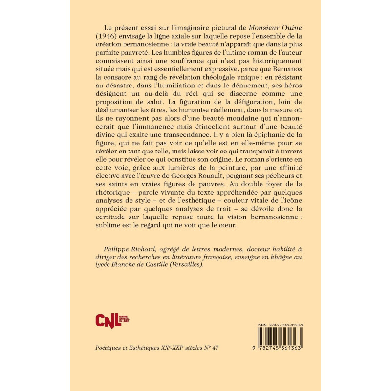 Le présent essai sur l’imaginaire pictural de Monsieur Ouine (1946) envisage la ligne axiale sur laquelle repose l’ensemble de la création bernanosienne : la vraie beauté n’apparaît que dans la plus parfaite pauvreté. Les humbles figures de l’ultime roman de l’auteur connaissent ainsi une souffrance qui n’est pas historiquement située mais qui est essentiellement expressive, parce que Bernanos la consacre au rang de révélation théologale unique : en résistant au désastre, dans l’humiliation et dans le dénuement, ses héros désignent un au-delà du réel qui se discerne comme une proposition de salut. La figuration de la défiguration, loin de déshumaniser les êtres, les humanise réellement, dans la mesure où ils ne rayonnent pas alors d’une beauté mondaine qui n’annoncerait que l’immanence mais étincellent surtout d’une beauté divine qui exalte une transcendance. Il y a bien là épiphanie de la figure, qui ne fait pas voir ce qu’elle est en elle-même pour se révéler en tant que telle, mais laisse voir ce qui transparaît à travers elle pour révéler ce qui constitue son origine. Le roman s’oriente en cette voie, grâce aux lumières de la peinture, par une affinité élective avec l’œuvre de Georges Rouault, peignant ses pécheurs et ses saints en vraies figures de pauvres. Au double foyer de la rhétorique – parole vivante du texte appréhendée par quelques analyses de style – et de l’esthétique – couleur vitale de l’icône appréciée par quelques analyses de trait – se dévoile donc la certitude sur laquelle repose toute la vision bernanosienne : sublime est le regard qui ne voit que le cœur.