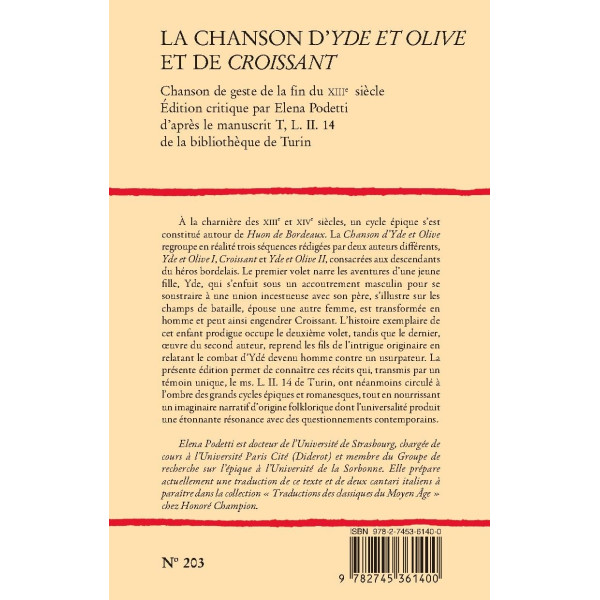 À la charnière des XIIIe et XIVe siècles, un cycle épique s’est constitué autour de Huon de Bordeaux. La Chanson d’Yde et Olive regroupe en réalité trois séquences rédigées par deux auteurs différents, Yde et Olive I, Croissant et Yde et Olive II, consacrées aux descendants du héros bordelais. Le premier volet narre les aventures d’une jeune fille, Yde, qui s’enfuit sous un accoutrement masculin pour se soustraire à une union incestueuse avec son père, s’illustre sur les champs de bataille, épouse une autre femme, est transformée en homme et peut ainsi engendrer Croissant. L’histoire exemplaire de cet enfant prodigue occupe le deuxième volet, tandis que le dernier, œuvre du second auteur, reprend les fils de l’intrigue originaire en relatant le combat d’Ydé devenu homme contre un usurpateur. La présente édition permet de connaître ces récits qui, transmis par un témoin unique, le ms. L. II. 14 de Turin, ont néanmoins circulé à l’ombre des grands cycles épiques et romanesques, tout en nourrissant un imaginaire narratif d’origine folklorique dont l’universalité produit une étonnante résonance avec des questionnements contemporains.