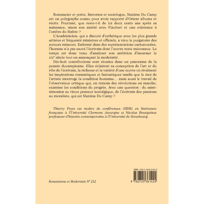 Dix-huit contributions sont réunies dans un panorama de la pensée ducampienne. Elles éclairent sa conception de l’art et du rôle de l’écrivain, la richesse et la variété d’une œuvre où rivalisent les inspirations romantiques et fantastiques tandis que le moi de l’artiste interroge la condition humaine… mais aussi le travail de l’observateur critique qui, en témoin des révolutions en marche, examine les conditions du progrès. Avec une question : du saint-simonien au vieux penseur nostalgique, de l’écrivain des passions au moraliste, qui est Maxime Du Camp ?