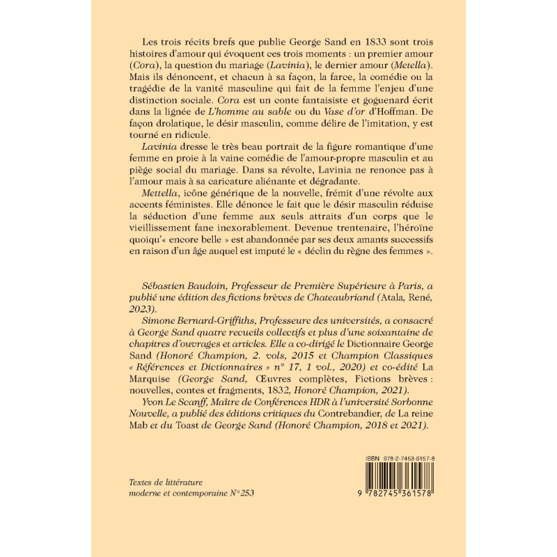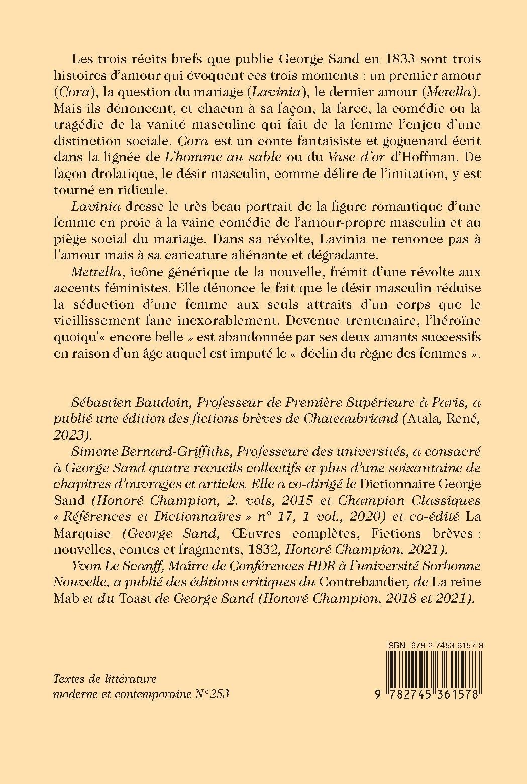 Les trois récits brefs que publie George Sand en 1833 sont trois histoires d’amour qui évoquent ces trois moments : un premier amour (Cora), la question du mariage (Lavinia), le dernier amour (Metella). Mais ils dénoncent, et chacun à sa façon, la farce, la comédie ou la tragédie de la vanité masculine qui fait de la femme l’enjeu d’une distinction sociale. Cora est un conte fantaisiste et goguenard écrit dans la lignée de L’homme au sable ou du Vase d’or d’Hoffman. De façon drolatique, le désir masculin, comme délire de l’imitation, y est tourné en ridicule.