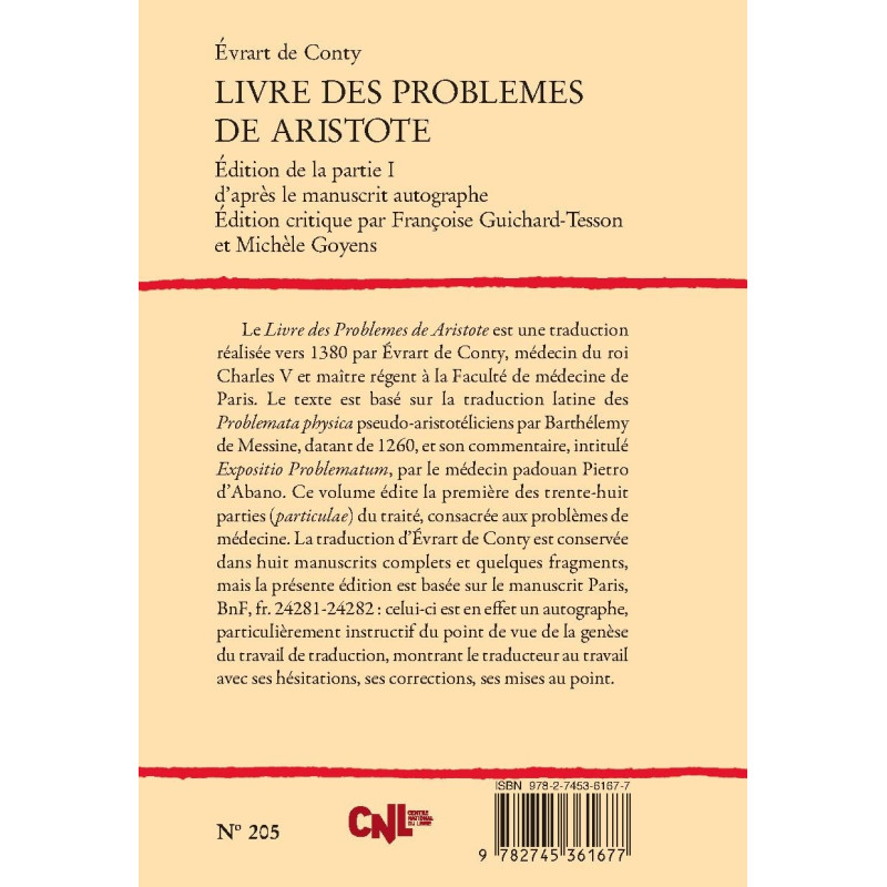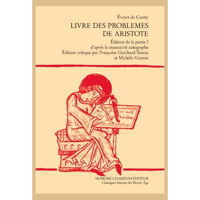 Le Livre des Problemes de Aristote est une traduction réalisée vers 1380 par Évrart de Conty, médecin du roi Charles V et maître régent à la Faculté de médecine de Paris. Le texte est basé sur la traduction latine des Problemata physica pseudo-aristotéliciens par Barthélemy de Messine, datant de 1260, et son commentaire, intitulé Expositio Problematum, par le médecin padouan Pietro d’Abano. Ce volume édite la première des trente-huit parties (particulae) du traité, consacrée aux problèmes de médecine. La traduction d’Évrart de Conty est conservée dans huit manuscrits complets et quelques fragments, mais la présente édition est basée sur le manuscrit Paris, BnF, fr. 24281-24282 : celui-ci est en effet un autographe, particulièrement instructif du point de vue de la genèse du travail de traduction, montrant le traducteur au travail avec ses hésitations, ses corrections, ses mises au point.