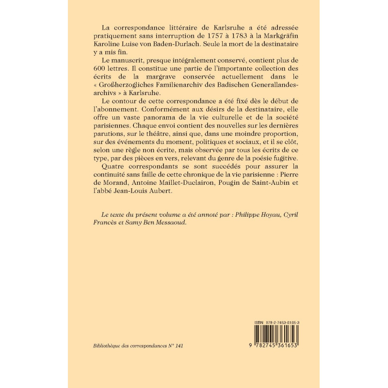 La correspondance littéraire de Karlsruhe a été adressée pratiquement sans interruption de 1757 à 1783 à la Markgräfin Karoline Luise von Baden-Durlach. Seule la mort de la destinataire y a mis fin.