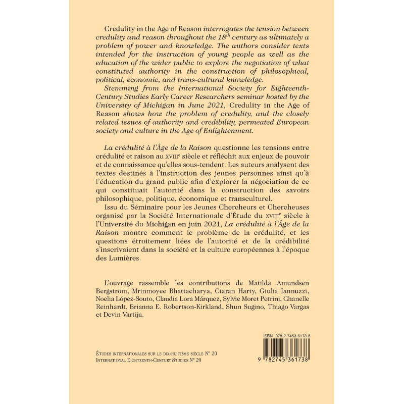 Stemming from the International Society for Eighteenth- Century Studies Early Career Researchers seminar hosted by the University of Michigan in June 2021, Credulity in the Age of Reason shows how the problem of credulity, and the closely related issues of authority and credibility, permeated European society and culture in the Age of Enlightenment.