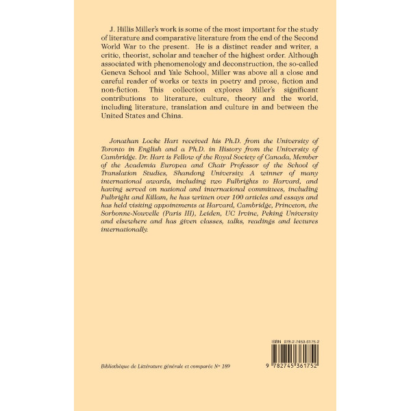 J. Hillis Miller’s work is some of the most important for the study of literature and comparative literature from the end of the Second World War to the present. He is a distinct reader and writer, a critic, theorist, scholar and teacher of the highest order. Although associated with phenomenology and deconstruction, the so-called Geneva School and Yale School, Miller was above all a close and careful reader of works or texts in pœtry and prose, fiction and non-fiction. This collection explores Miller’s significant contributions to literature, culture, theory and the world, including literature, translation and culture in and between the United States and China.
