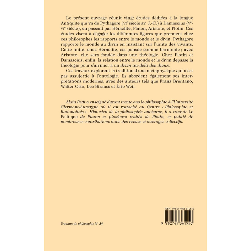 Le présent ouvrage réunit vingt études dédiées à la longue Antiquité qui va de Pythagore (VIe siècle av. J.-C.) à Damascius (Ve-VIe siècle), en passant par Héraclite, Platon, Aristote, et Plotin. Ces études visent à dégager les différentes figures que prennent chez ces philosophes les rapports entre le monde et le divin. Pythagore rapporte le monde au divin en insistant sur l’unité des vivants. Cette unité, chez Héraclite, est pensée comme harmonie ; avec Aristote, elle sera fondée dans une théologie. Chez Plotin et Damascius, enfin, la relation entre le monde et le divin dépasse la théologie pour s’arrimer à un divin au-delà des dieux.