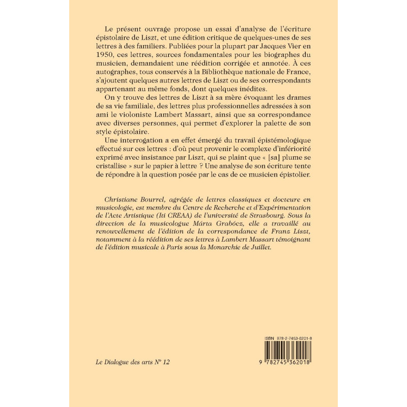 Le présent ouvrage propose un essai d’analyse de l’écriture épistolaire de Liszt, et une édition critique de quelques-unes de ses lettres à des familiers. Publiées pour la plupart par Jacques Vier en 1950, ces lettres, sources fondamentales pour les biographes du musicien, demandaient une réédition corrigée et annotée. À ces autographes, tous conservés à la Bibliothèque nationale de France, s’ajoutent quelques autres lettres de Liszt ou de ses correspondants appartenant au même fonds, dont quelques inédites.