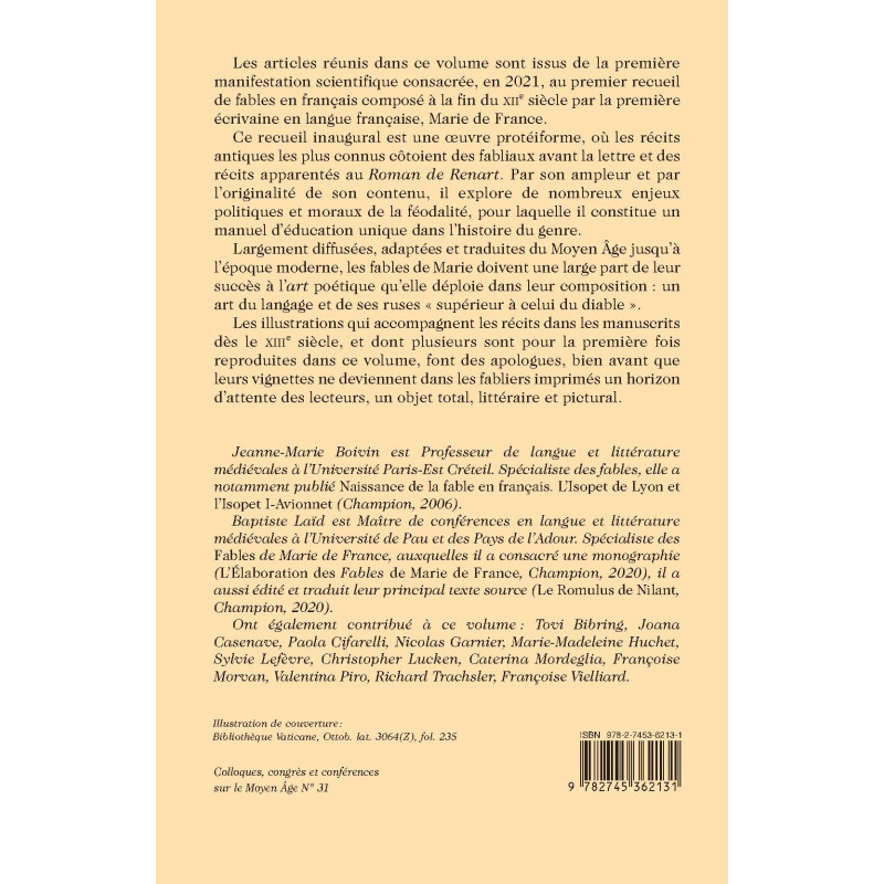 Les articles réunis dans ce volume sont issus de la première manifestation scientifique consacrée, en 2021, au premier recueil de fables en français composé à la fin du XIIe siècle par la première écrivaine en langue française, Marie de France.