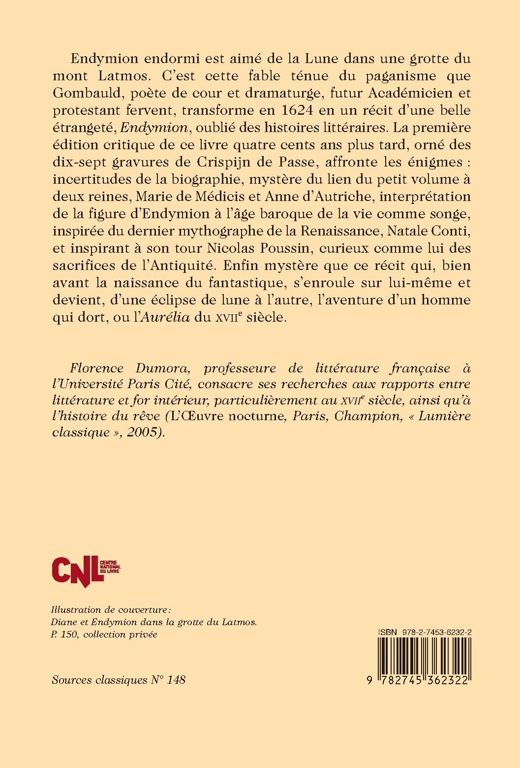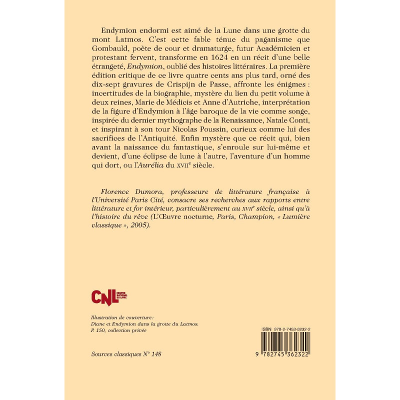 Endymion endormi est aimé de la Lune dans une grotte du mont Latmos. C’est cette fable ténue du paganisme que Gombauld, poète de cour et dramaturge, futur Académicien et protestant fervent, transforme en 1624 en un récit d’une belle étrangeté, Endymion, oublié des histoires littéraires. La première édition critique de ce livre quatre cents ans plus tard, orné des dix-sept gravures de Crispijn de Passe, affronte les énigmes : incertitudes de la biographie, mystère du lien du petit volume à deux reines, Marie de Médicis et Anne d’Autriche, interprétation de la figure d’Endymion à l’âge baroque de la vie comme songe, inspirée du dernier mythographe de la Renaissance, Natale Conti, et inspirant à son tour Nicolas Poussin, curieux comme lui des sacrifices de l’Antiquité. Enfin mystère que ce récit qui, bien avant la naissance du fantastique, s’enroule sur lui-même et devient, d’une éclipse de lune à l’autre, l’aventure d’un homme qui dort, ou l’Aurélia du XVIIe siècle.