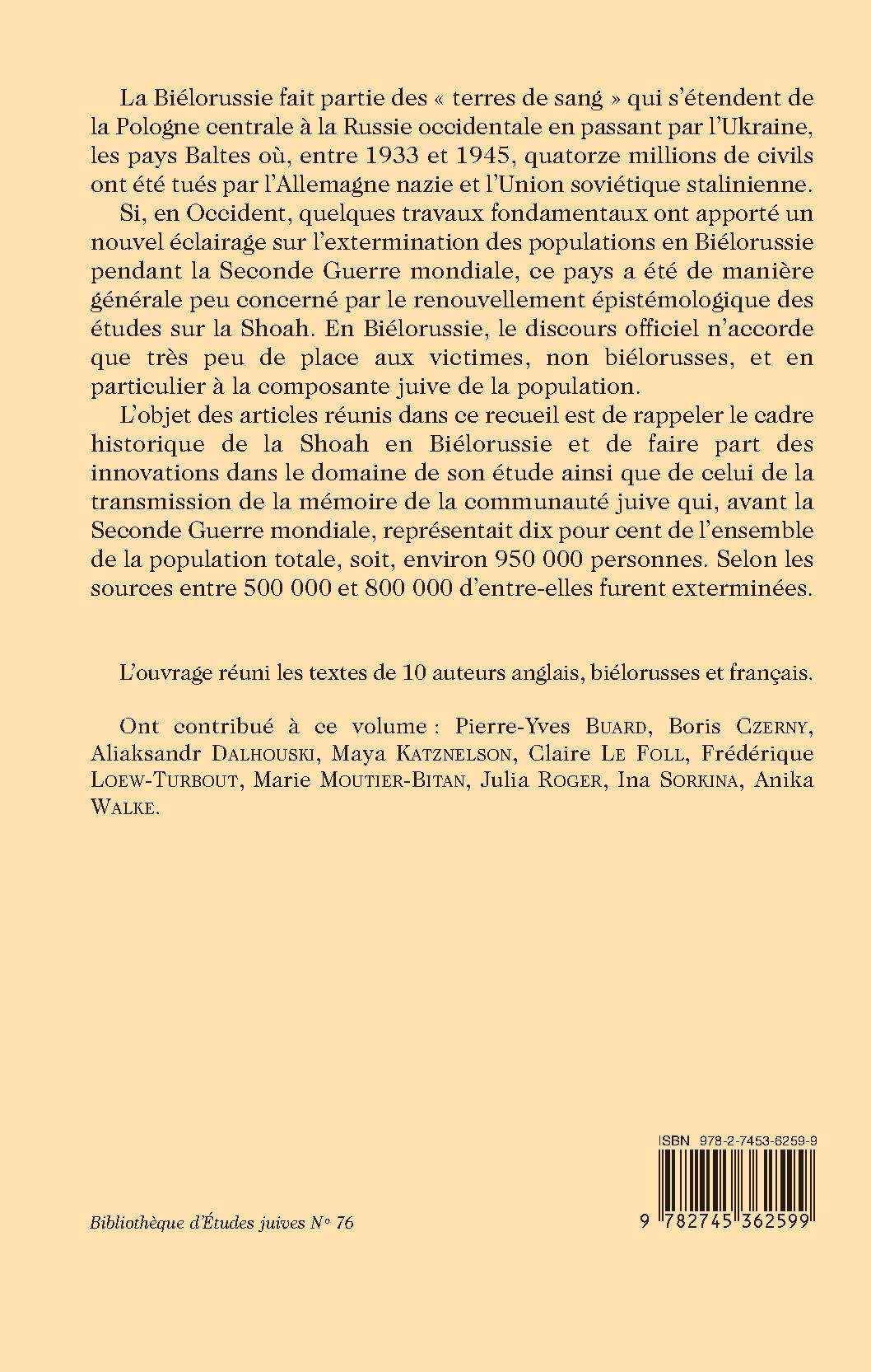 L’objet des articles réunis dans ce recueil est de rappeler le cadre historique de la Shoah en Biélorussie et de faire part des innovations dans le domaine de son étude ainsi que de celui de la transmission de la mémoire de la communauté juive qui, avant la Seconde Guerre mondiale, représentait dix pour cent de l’ensemble de la population totale, soit, environ 950 000 personnes. Selon les sources entre 500 000 et 800 000 d’entre-elles furent exterminées.