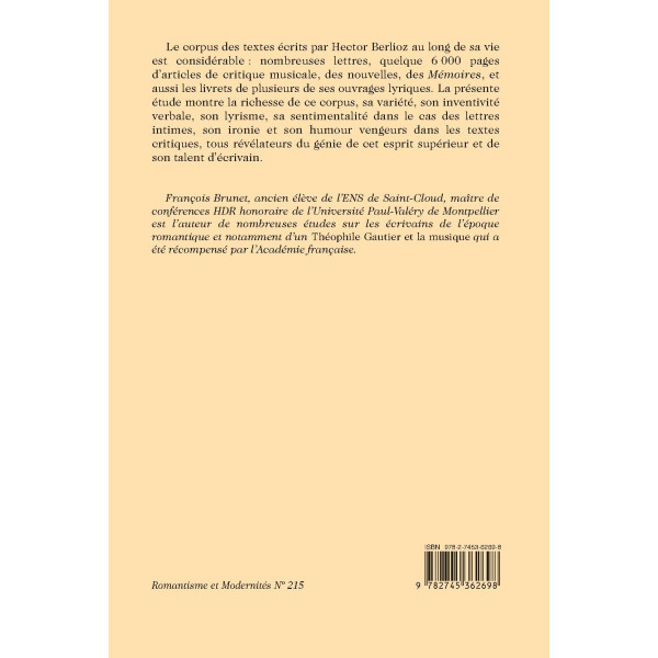 Le corpus des textes écrits par Hector Berlioz au long de sa vie est considérable : nombreuses lettres, quelque 6 000 pages d’articles de critique musicale, des nouvelles, des Mémoires, et aussi les livrets de plusieurs de ses ouvrages lyriques. La présente étude montre la richesse de ce corpus, sa variété, son inventivité verbale, son lyrisme, sa sentimentalité dans le cas des lettres intimes, son ironie et son humour vengeurs dans les textes critiques, tous révélateurs du génie de cet esprit supérieur et de son talent d’écrivain.