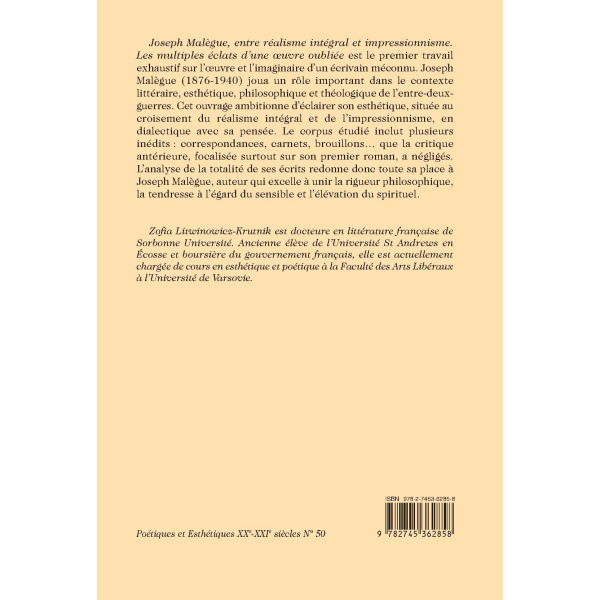 Joseph Malègue, entre réalisme intégral et impressionnisme. Les multiples éclats d’une œuvre oubliée est le premier travail exhaustif sur l’œuvre et l’imaginaire d’un écrivain méconnu. Joseph Malègue (1876-1940) joua un rôle important dans le contexte littéraire, esthétique, philosophique et théologique de l’entre-deux-guerres. Cet ouvrage ambitionne d’éclairer son esthétique, située au croisement du réalisme intégral et de l’impressionnisme, en dialectique avec sa pensée. Le corpus étudié inclut plusieurs inédits : correspondances, carnets, brouillons… que la critique antérieure, focalisée surtout sur son premier roman, a négligés. L’analyse de la totalité de ses écrits redonne donc toute sa place à Joseph Malègue, auteur qui excelle à unir la rigueur philosophique, la tendresse à l’égard du sensible et l’élévation du spirituel.