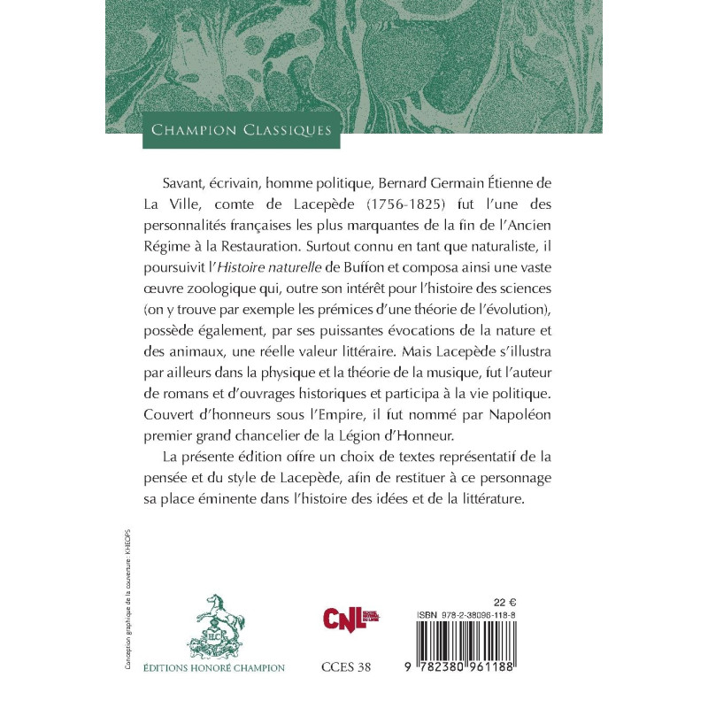 La présente édition offre un choix de textes représentatif de la pensée et du style de Lacepède, afin de restituer à ce personnage sa place éminente dans l’histoire des idées et de la littérature.