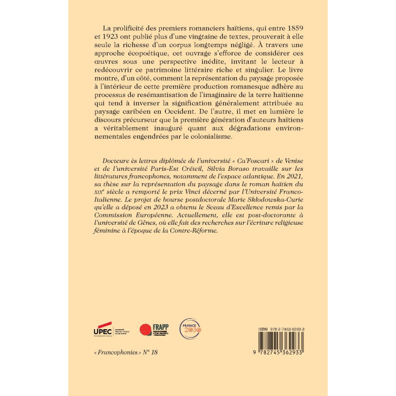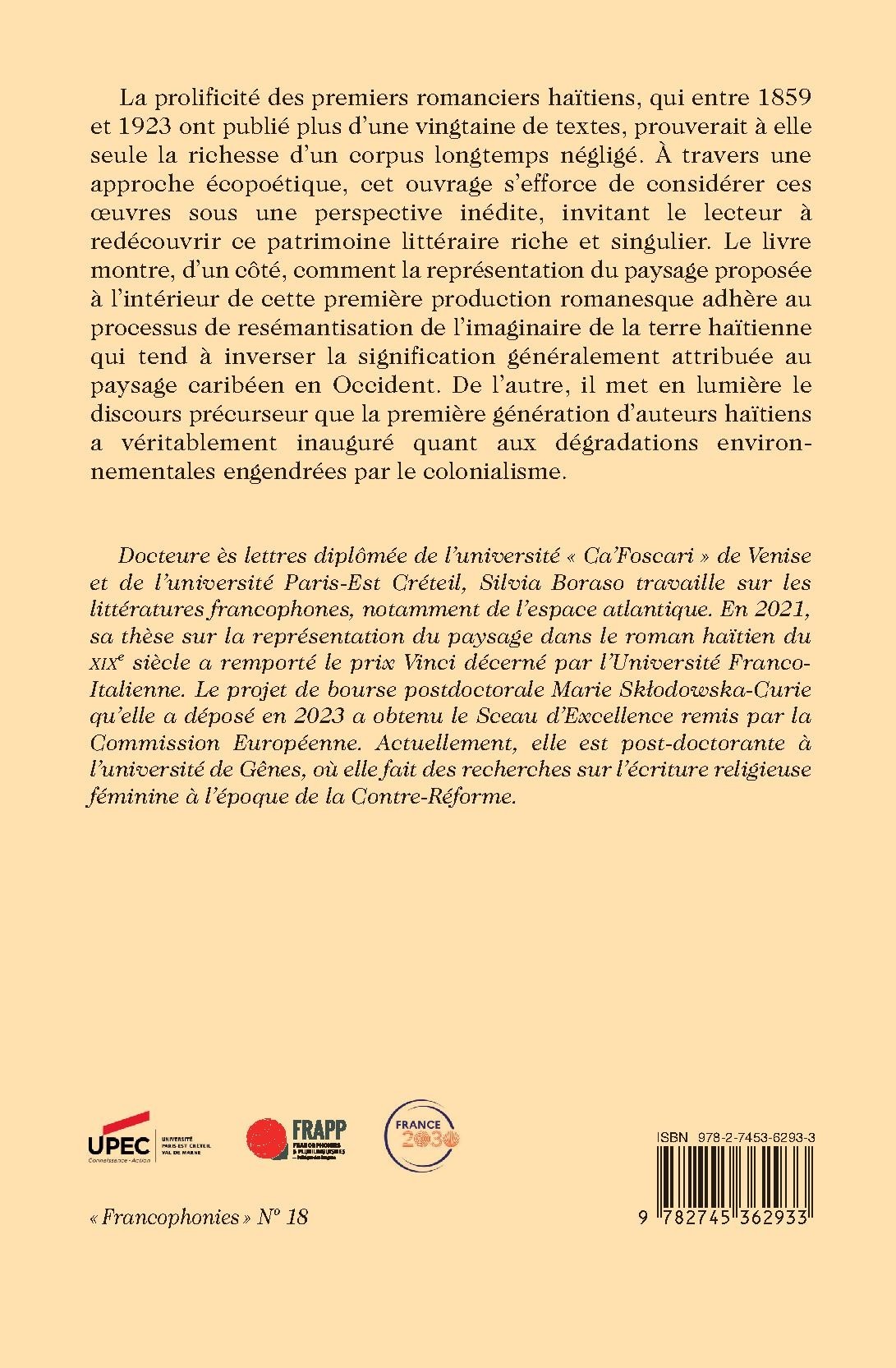 La prolificité des premiers romanciers haïtiens, qui entre 1859 et 1923 ont publié plus d’une vingtaine de textes, prouverait à elle seule la richesse d’un corpus longtemps négligé. À travers une approche écopoétique, cet ouvrage s’efforce de considérer ces œuvres sous une perspective inédite, invitant le lecteur à redécouvrir ce patrimoine littéraire riche et singulier. Le livre montre, d’un côté, comment la représentation du paysage proposée à l’intérieur de cette première production romanesque adhère au processus de resémantisation de l’imaginaire de la terre haïtienne qui tend à inverser la signification généralement attribuée au paysage caribéen en Occident. De l’autre, il met en lumière le discours précurseur que la première génération d’auteurs haïtiens a véritablement inauguré quant aux dégradations environnementales engendrées par le colonialisme.