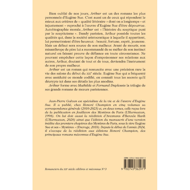 Bien oublié de nos jours, Arthur est un des romans les plus personnels d’Eugène Sue. C’est aussi un de ceux qui répondent le mieux aux critères de « qualité littéraire » dont on a longtemps – et injustement – reproché à l’œuvre d’Eugène Sue d’être dépourvue. Autobiographie morale, Arthur est « l’histoire du sceptique puni par le scepticisme ». Dandy parisien, Arthur possède toutes les qualités qui, dans la société aristocratique à laquelle il appartient, lui permettraient d’être heureux : beauté, fortune, esprit, jeunesse. Mais un défaut sera source de son malheur. Avant de mourir, son misanthrope de père lui a recommandé de se méfier de son instinct naturel en faisant preuve de défiance en toute circonstance. Ne pouvant empêcher cette leçon d’empoisonner ses relations aux autres, Arthur, doutant de tout et de tous, deviendra l’instrument de son propre malheur.