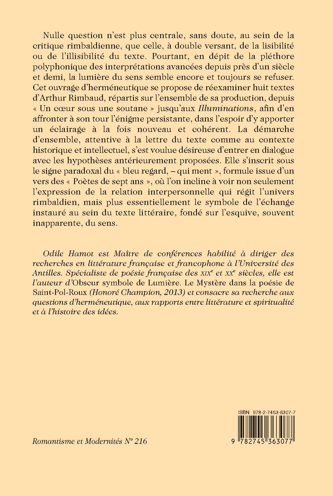 Nulle question n’est plus centrale, sans doute, au sein de la critique rimbaldienne, que celle, à double versant, de la lisibilité ou de l’illisibilité du texte. Pourtant, en dépit de la pléthore polyphonique des interprétations avancées depuis près d’un siècle et demi, la lumière du sens semble encore et toujours se refuser. Cet ouvrage d’herméneutique se propose de réexaminer huit textes d’Arthur Rimbaud, répartis sur l’ensemble de sa production, depuis « Un cœur sous une soutane » jusqu’aux Illuminations, afin d’en affronter à son tour l’énigme persistante, dans l’espoir d’y apporter un éclairage à la fois nouveau et cohérent. La démarche d’ensemble, attentive à la lettre du texte comme au contexte historique et intellectuel, s’est voulue désireuse d’entrer en dialogue avec les hypothèses antérieurement proposées. Elle s’inscrit sous le signe paradoxal du « bleu regard, – qui ment », formule issue d’un vers des « Poètes de sept ans », où l’on incline à voir non seulement l’expression de la relation interpersonnelle qui régit l’univers rimbaldien, mais plus essentiellement le symbole de l’échange instauré au sein du texte littéraire, fondé sur l’esquive, souvent inapparente, du sens.