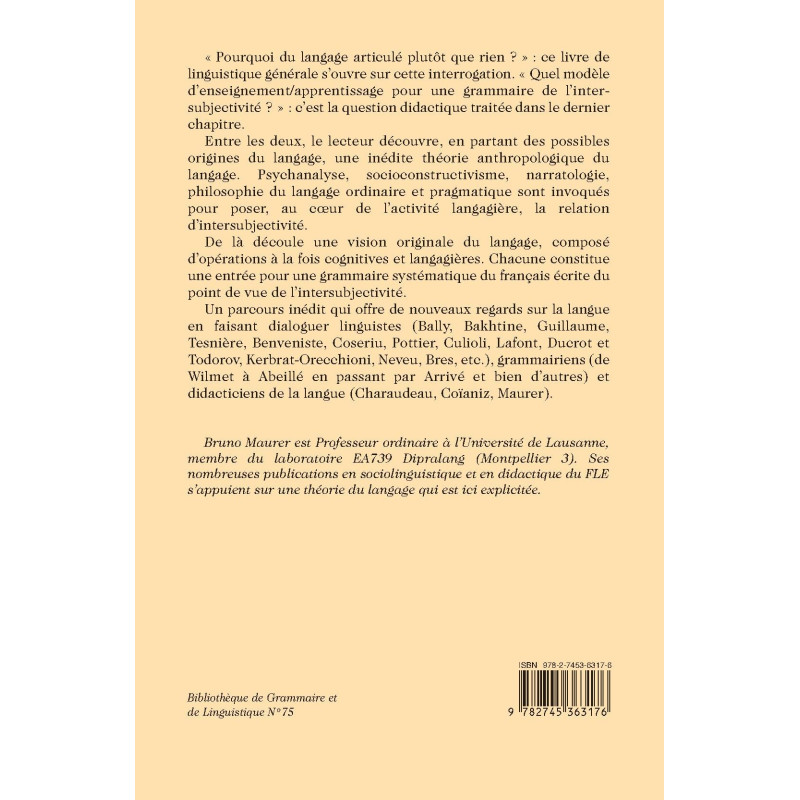 « Pourquoi du langage articulé plutôt que rien ? » : ce livre de linguistique générale s’ouvre sur cette interrogation. « Quel modèle d’enseignement/apprentissage pour une grammaire de l’intersubjectivité ? » : c’est la question didactique traitée dans le dernier chapitre.
