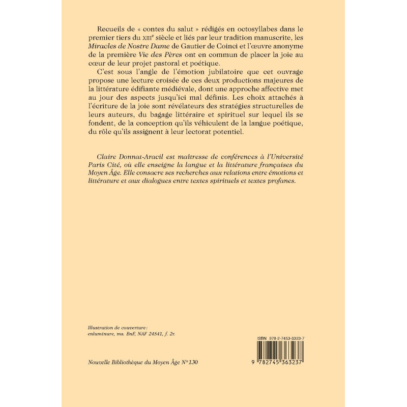 C’est sous l’angle de l’émotion jubilatoire que cet ouvrage propose une lecture croisée de ces deux productions majeures de la littérature édifiante médiévale, dont une approche affective met au jour des aspects jusqu’ici mal définis. Les choix attachés à l’écriture de la joie sont révélateurs des stratégies structurelles de leurs auteurs, du bagage littéraire et spirituel sur lequel ils se fondent, de la conception qu’ils véhiculent de la langue poétique, du rôle qu’ils assignent à leur lectorat potentiel.