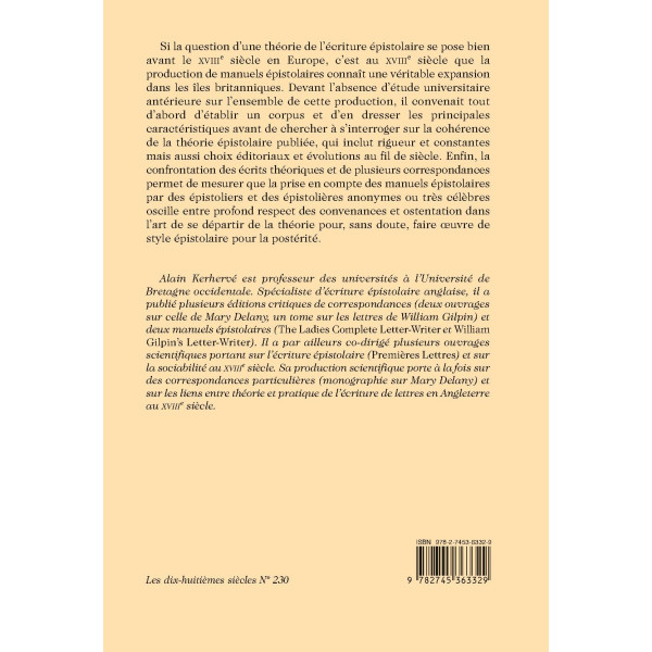 Alain Kerhervé est professeur des universités à l’Université de Bretagne occidentale. Spécialiste d’écriture épistolaire anglaise, il a publié plusieurs éditions critiques de correspondances (deux ouvrages sur celle de Mary Delany, un tome sur les lettres de William Gilpin) et deux manuels épistolaires (The Ladies Complete Letter-Writer et William Gilpin’s Letter-Writer). Il a par ailleurs co-dirigé plusieurs ouvrages scientifiques portant sur l’écriture épistolaire (Premières Lettres) et sur la sociabilité au XVIIIe siècle. Sa production scientifique porte à la fois sur des correspondances particulières (monographie sur Mary Delany) et sur les liens entre théorie et pratique de l’écriture de lettres en Angleterre au XVIIIe siècle.
